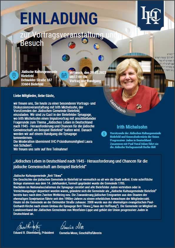 IHC Vortrags- und Diskussionsveranstaltung mit Irith Michelsohn, Vorstand jüdische Kultusgemeinde – bitte beachten: Start 17:00 Uhr