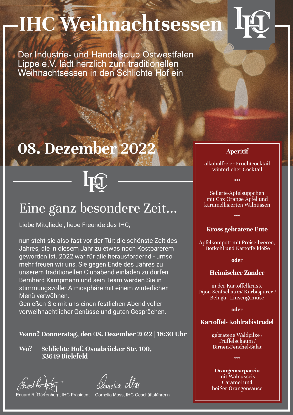 Zahlungsbedingungen Bitte beachten Sie: Das Essen und die Getränke bitten wir dieses Mal direkt vor Ort zu bezahlen. Sollten Sie nicht teilnehmen können, bitten wir aus organisatorischen Gründen, um Absage bis spätestens 05.12.2022. Vielen Dank für Ihr Verständnis.