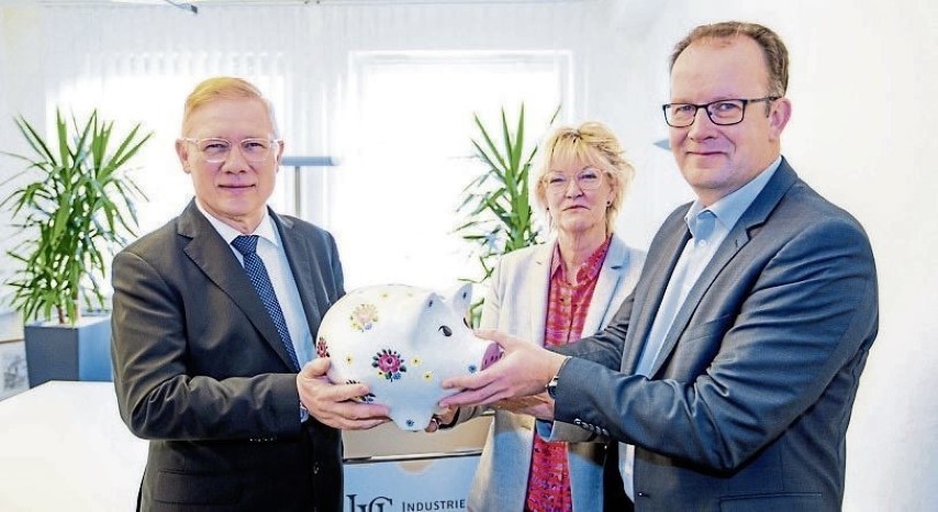 IHC-Geschäftsführerin Susanne Schaefer-Dieterle und Martin Knabenreich überreichen symbolisch ein Sparschwein an Dr. Rainer Norden (links), Aufsichtsratsvorsitzender der EvKB.