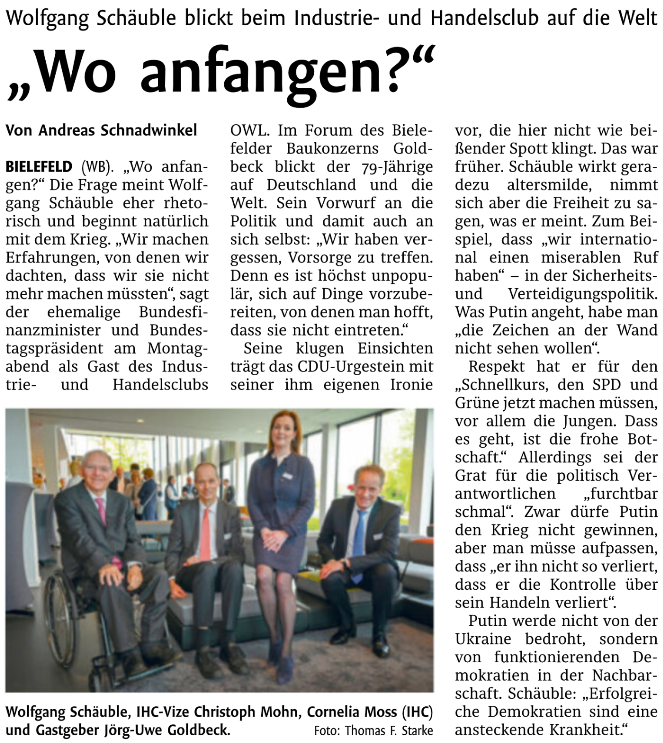 „Wo anfangen?“ Die Frage meint Wolfgang Schäuble eher rhetorisch und beginnt natürlich mit dem Krieg. „Wir machen Erfahrungen, von denen wir dachten, dass wir sie nicht mehr machen müssten“, sagt der ehemalige Bundesfinanzminister und Bundestagspräsident am Montagabend als Gast des Industrie- und Handelsclubs OWL.