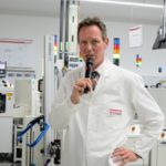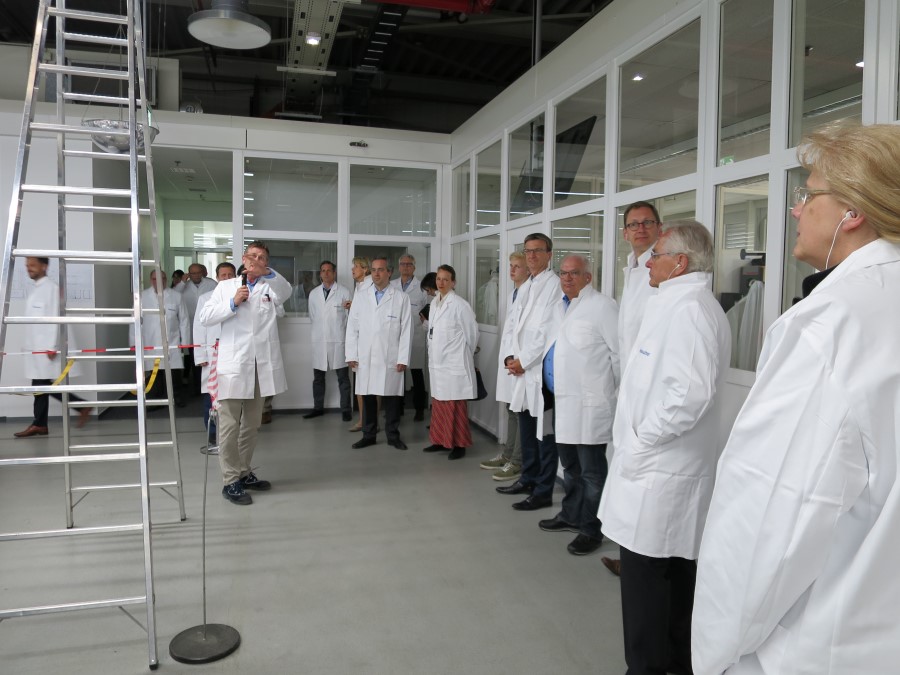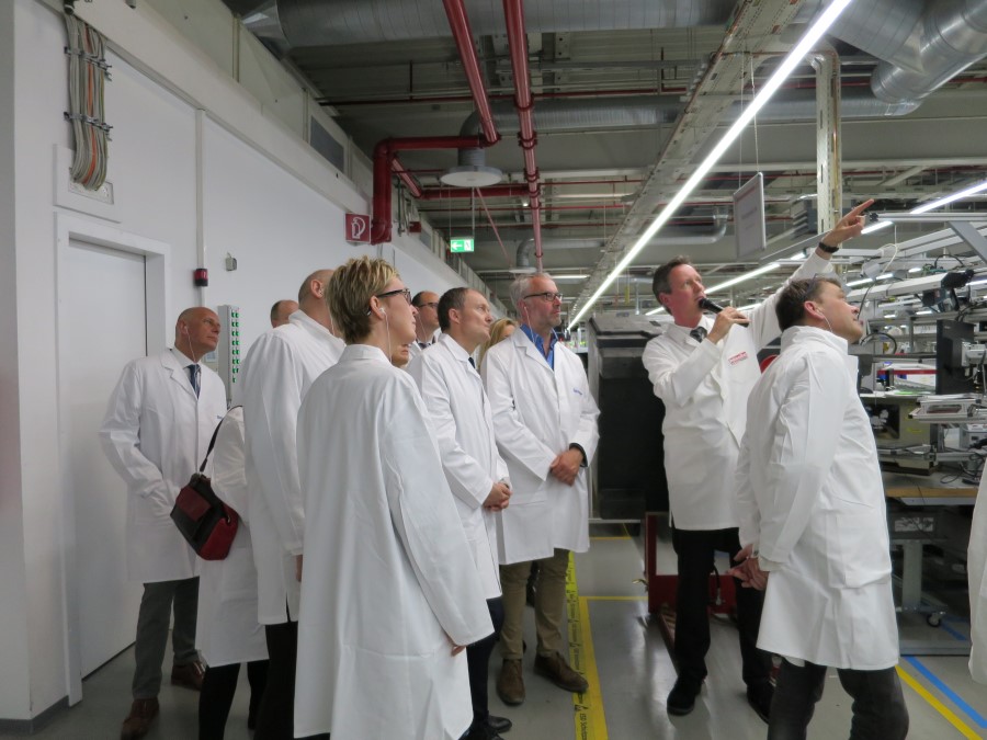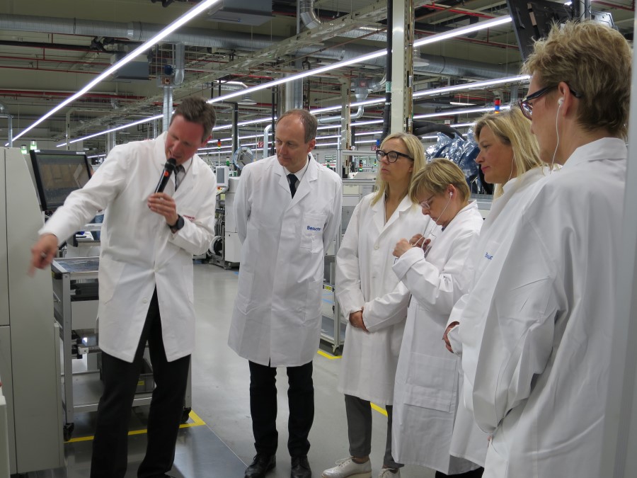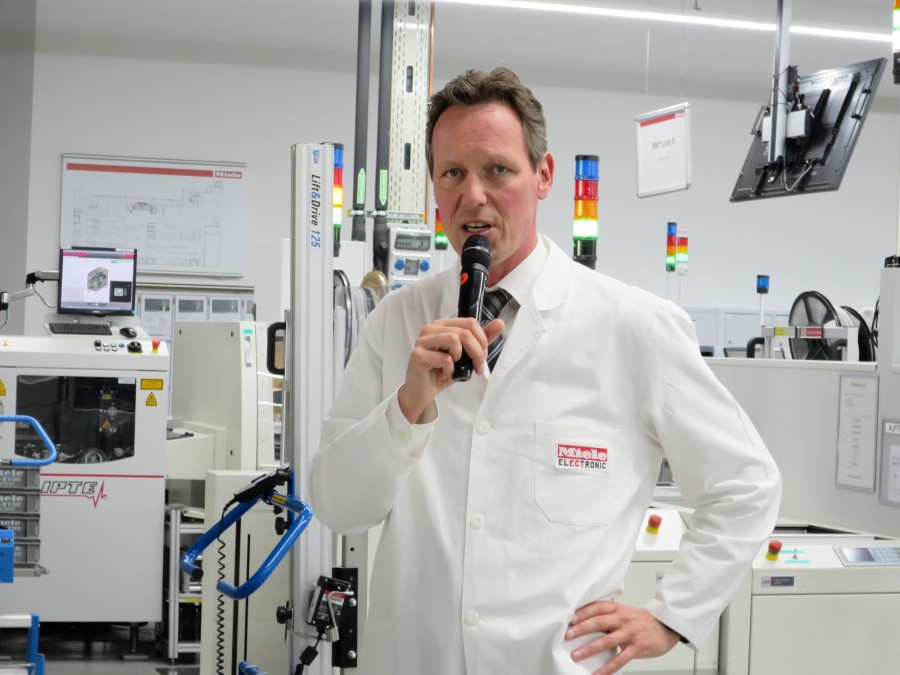 Nach einer kurzen Begrüßung begab sich die Gruppe auf eine Besichtigungsrunde unter der Führung von Peter Hübinger, Leiter Geschäftsbereich Smart Home und Leiter des Werks Electronic und vier seiner Kollegen. Diese gaben den Gästen einen spannenden Einblick in die Komplexität des mikroelektronischen Innenlebens der Miele-Geräte und in dessen hochautomatisierte Produktion.