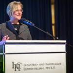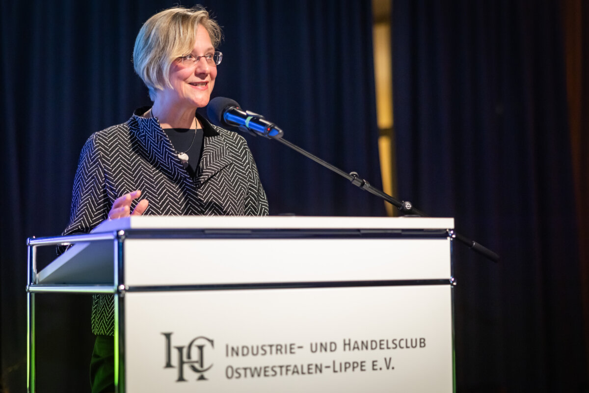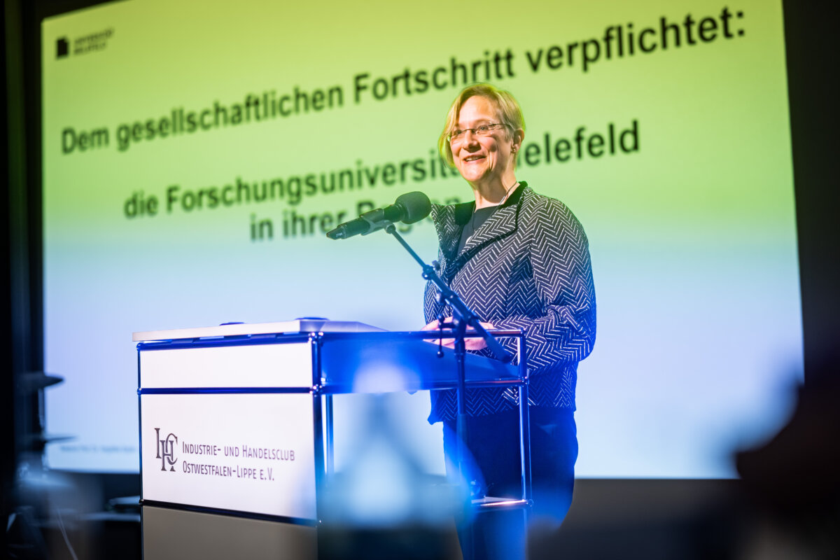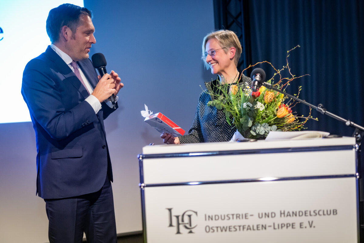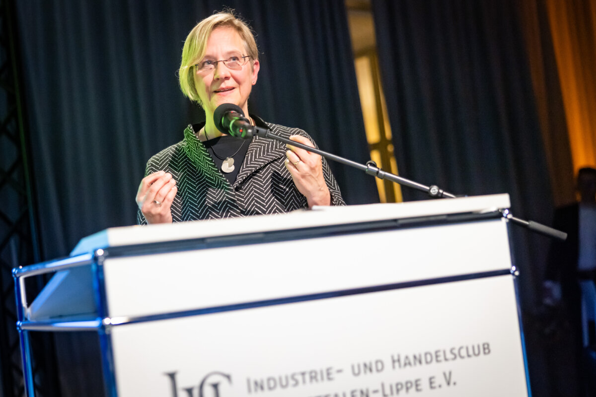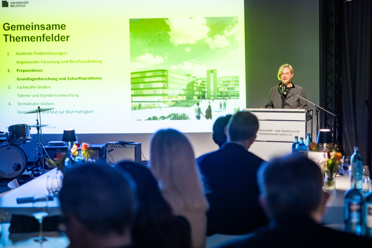 Unter dem Motto „Dem gesellschaftlichen Fortschritt verpflichtet“ hielt anschließend Gastrednerin Prof. Dr. Angelika Epple, seit Oktober 2023 Rektorin der Universität Bielefeld, das Hauptreferat des Abends. Hierin zeigte die Historikerin viele Parallelen und Schnittstellen zwischen Universität und den hiesigen Unternehmen auf. Hochschulen wie Firmen bemühten sich beide auf ihre Weise um Lösungen für aktuelle Probleme. Zum anderen betrieben beide Seiten auch Grundlagenforschung. So spiele die „Preparedness“, das Vorbereitet sein auf zukünftige Szenarien, eine immer wichtigere Rolle. Als Beispiel für gute Kooperation nannte die Rektorin den an Universität und Fachhochschule angegliederten Bielefelder Research und Innovation Campus BRIC. Er sei ein Ort, wo Wissenschaft und Unternehmen der Region gemeinsam an Herausforderungen der Zukunft arbeiteten.