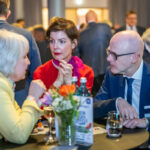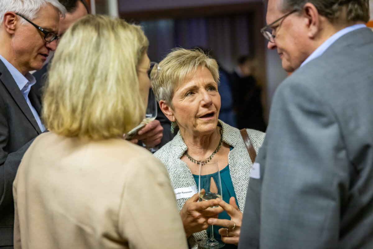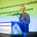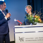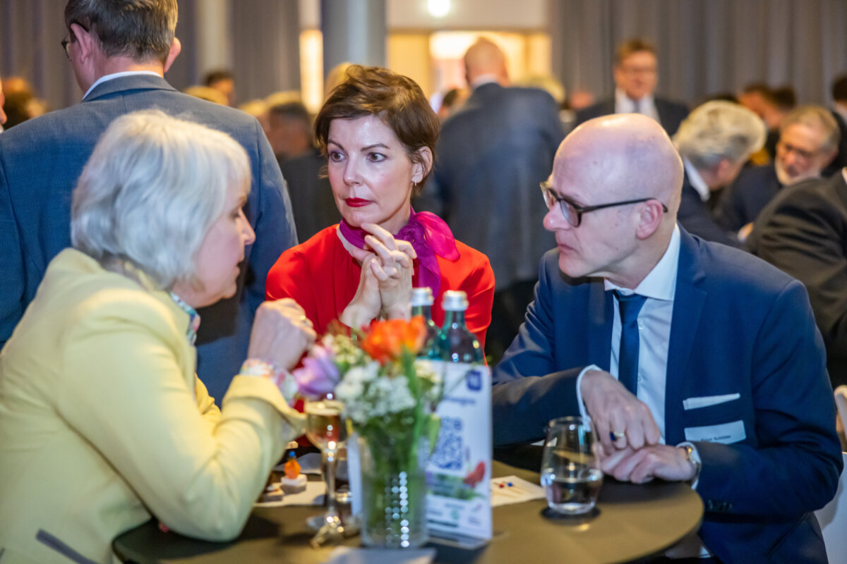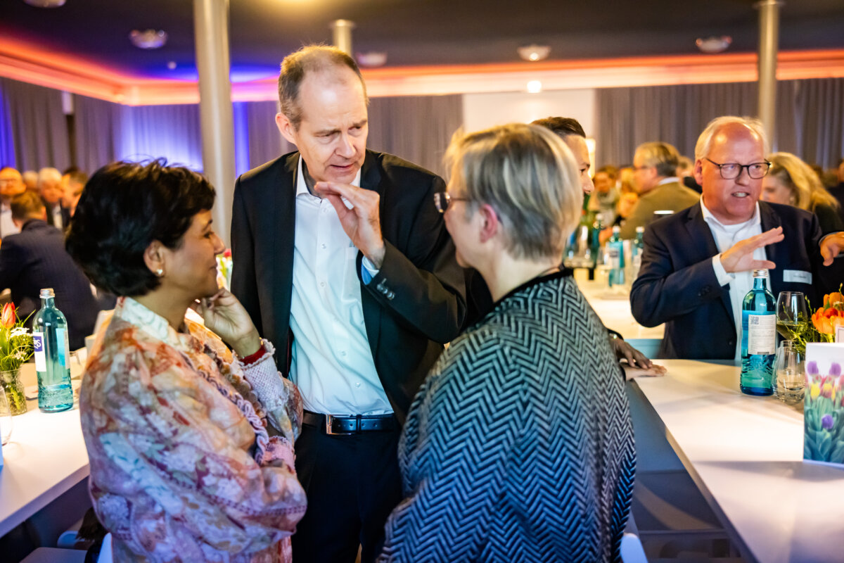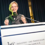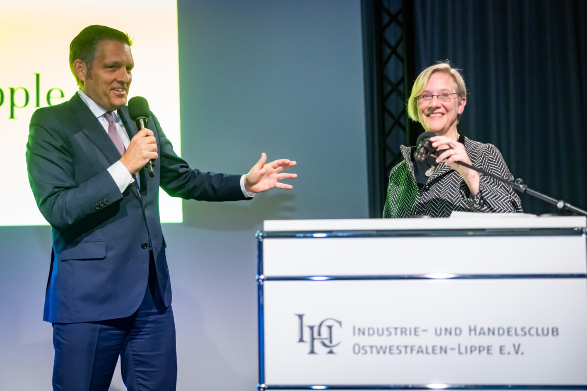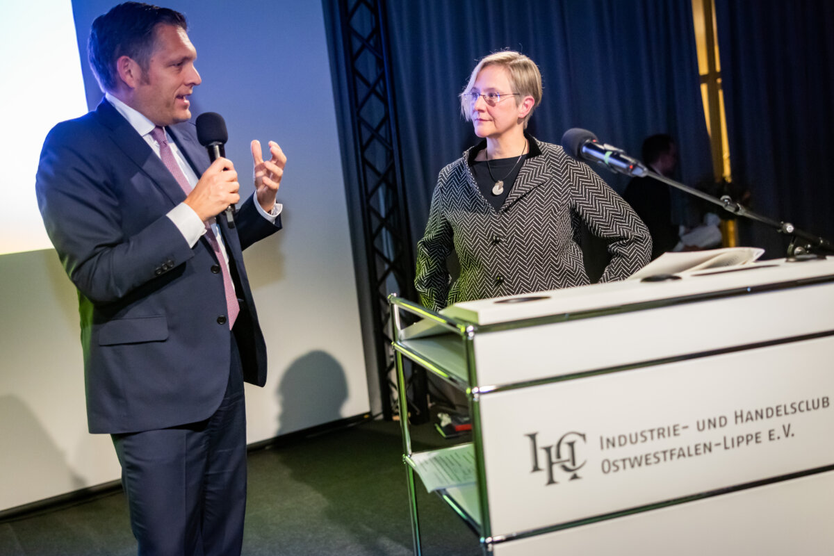 Unter dem Motto „Dem gesellschaftlichen Fortschritt verpflichtet“ hielt anschließend Gastrednerin Prof. Dr. Angelika Epple, seit Oktober 2023 Rektorin der Universität Bielefeld, das Hauptreferat des Abends. Hierin zeigte die Historikerin viele Parallelen und Schnittstellen zwischen Universität und den hiesigen Unternehmen auf. Hochschulen wie Firmen bemühten sich beide auf ihre Weise um Lösungen für aktuelle Probleme. Zum anderen betrieben beide Seiten auch Grundlagenforschung. So spiele die „Preparedness“, das Vorbereitet sein auf zukünftige Szenarien, eine immer wichtigere Rolle. Als Beispiel für gute Kooperation nannte die Rektorin den an Universität und Fachhochschule angegliederten Bielefelder Research und Innovation Campus BRIC. Er sei ein Ort, wo Wissenschaft und Unternehmen der Region gemeinsam an Herausforderungen der Zukunft arbeiteten.