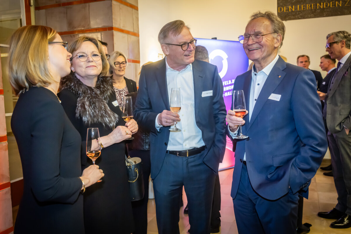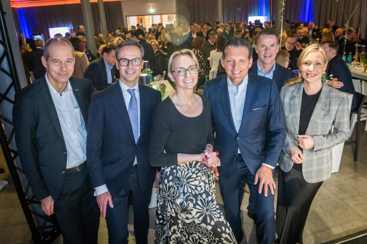 Dr. Christiana Bauer Oberbürgermeisterin der Stadt Bielefeld zu Gast beim IHC Jahresempfang (v. l. IHC Vizepräsident Christoph Mohn, Dr. Peter Peters, Oberbürgermeisterin der Stadt Bielefeld Dr. Christiana Bauer, IHC Präsident Eduard R. Dörrenberg, Oliver Flaskämper, Laura von Schubert)