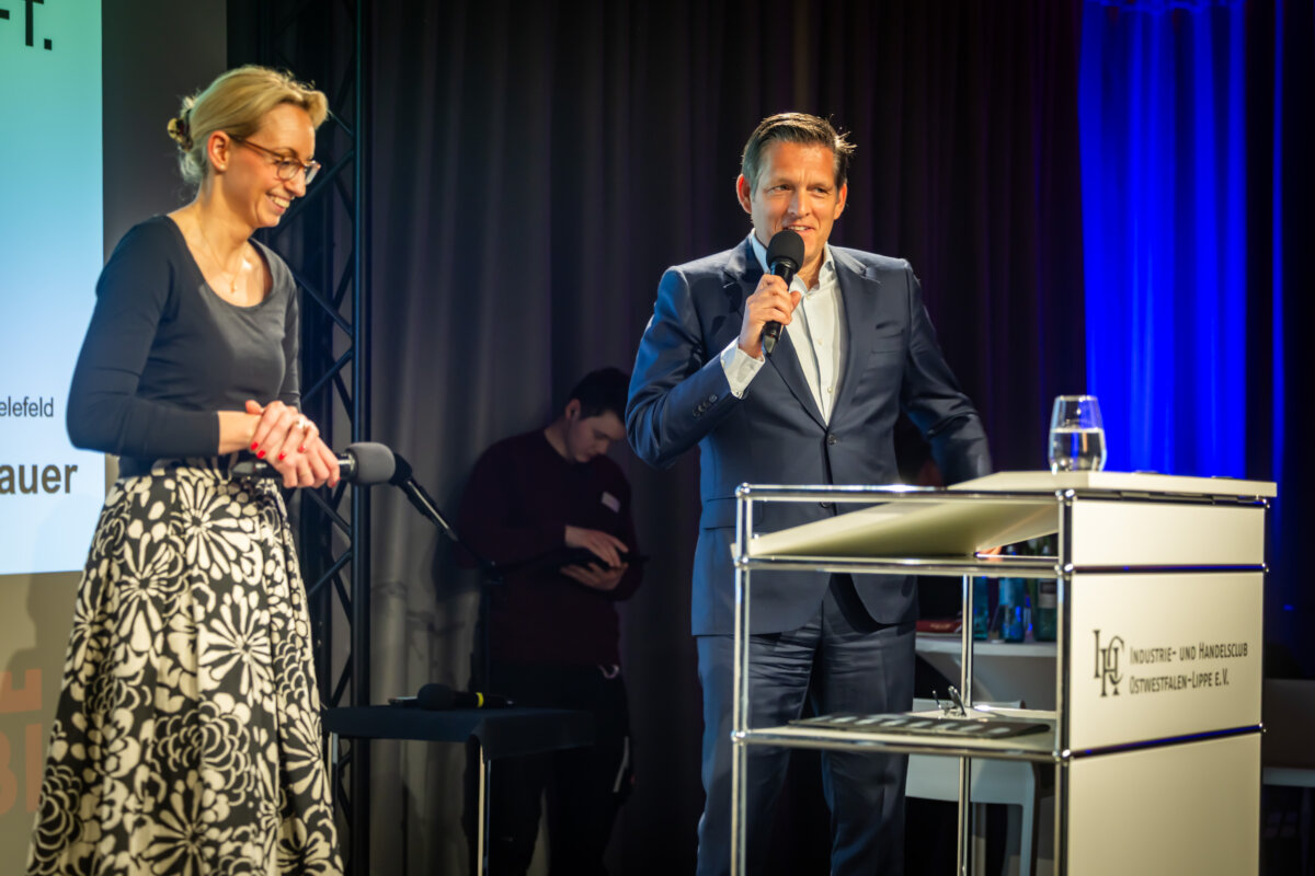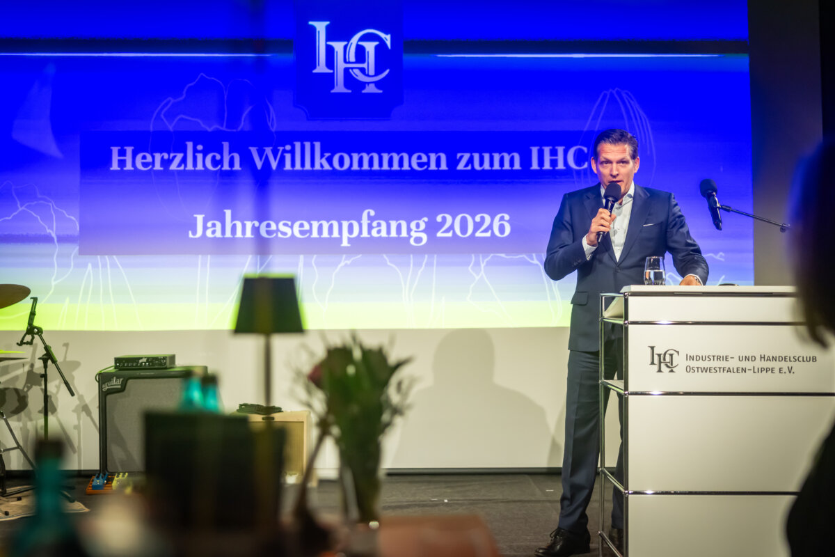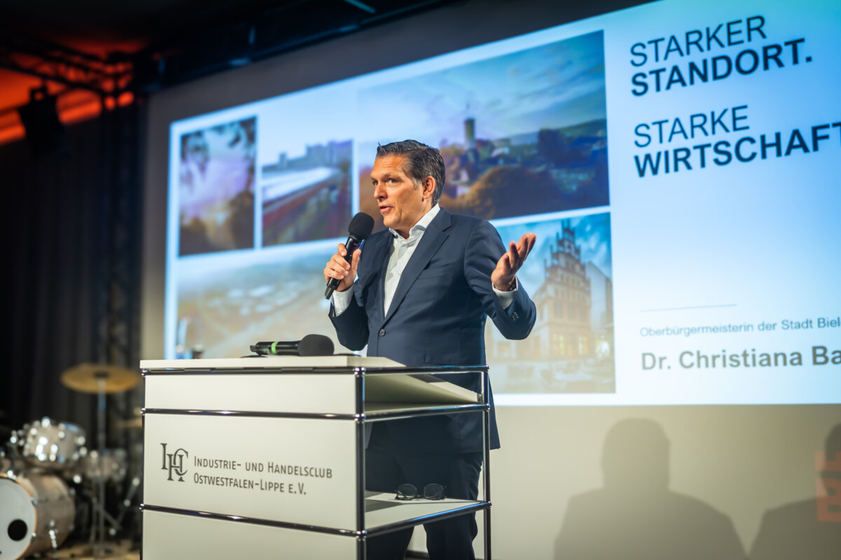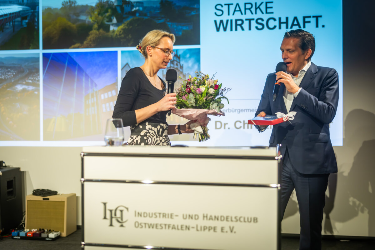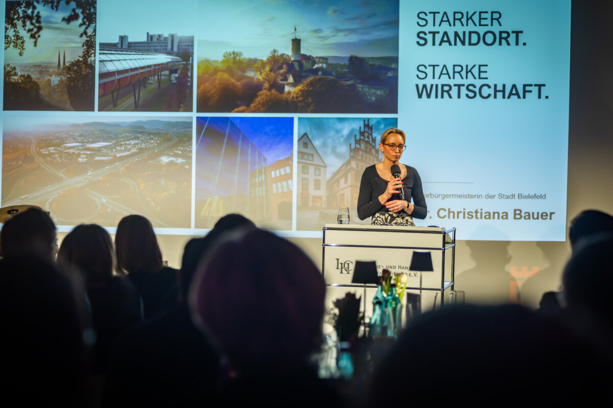 „Fordern Sie uns heraus und sagen Sie uns, wo wir besser werden müssen. Ich verspreche keine Wunder, aber Haltung, Klarheit und Verlässlichkeit“. Auf die Schlussworte der Keynote folgte lang anhaltender Applaus. Bei ihrem Antrittsbesuch auf dem IHC Jahresempfang traf Dr. Christiana Bauer, seit November Oberbürgermeisterin von Bielefeld, offenbar den richtigen Ton bei den anwesenden Wirtschaftsvertreterinnen und -vertretern.