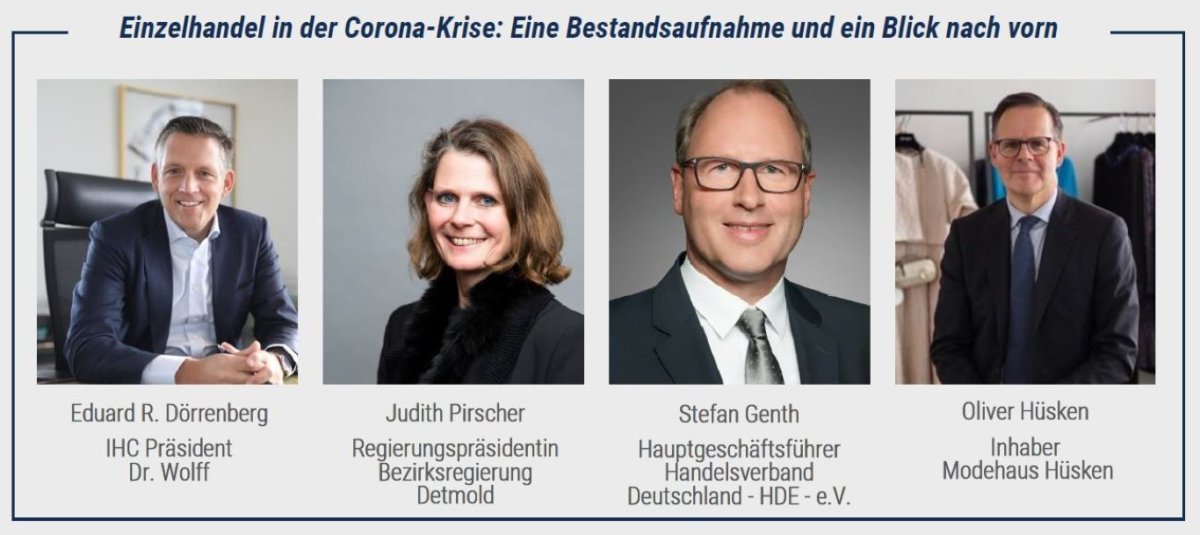 „Der Einzelhandel in der Corona-Krise: Eine Bestandsaufnahme und ein Blick nach vorn“ diskutierten am 18.06.2020 Stefan Genth, Hauptgeschäftsführer Handelsverband Deutschland – HDE – e.V., Regierungspräsidentin Judith Pirscher, Bezirksregierung Detmold und Oliver Hüsken, Inhaber Modehaus Hüsken – die Moderation übernahm IHC Präsident Eduard R. Dörrenberg.