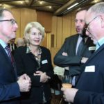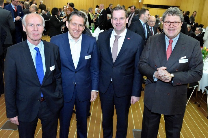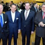 IHC Präsident Dr. Reinhard Ch. Zinkann (r.), IHC Ehrenmitglied Herbert Sommer (l.) und IHC Präsidiumsmitglied Eduard R. Dörrenberg (2.v.l.) begrüßen Dr. Jens Prager, Hauptgeschäftsführer Handwerkskammer Ostwestfalen-Lippe, als Redner des IHC Neujahrsempfangs 2019.