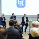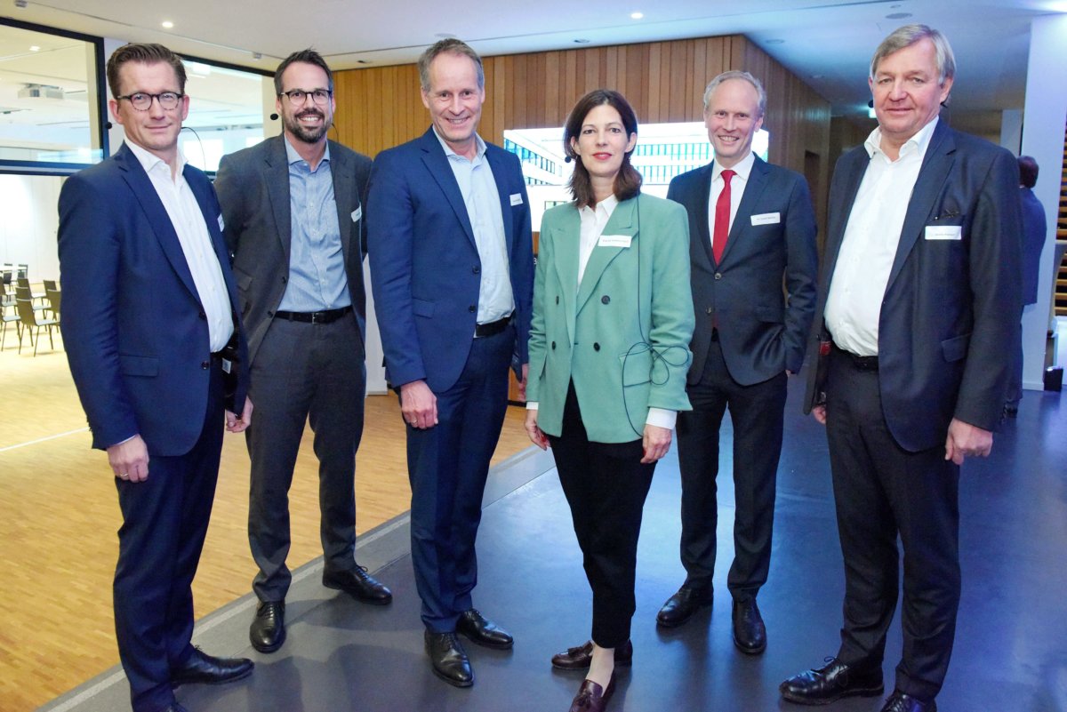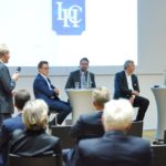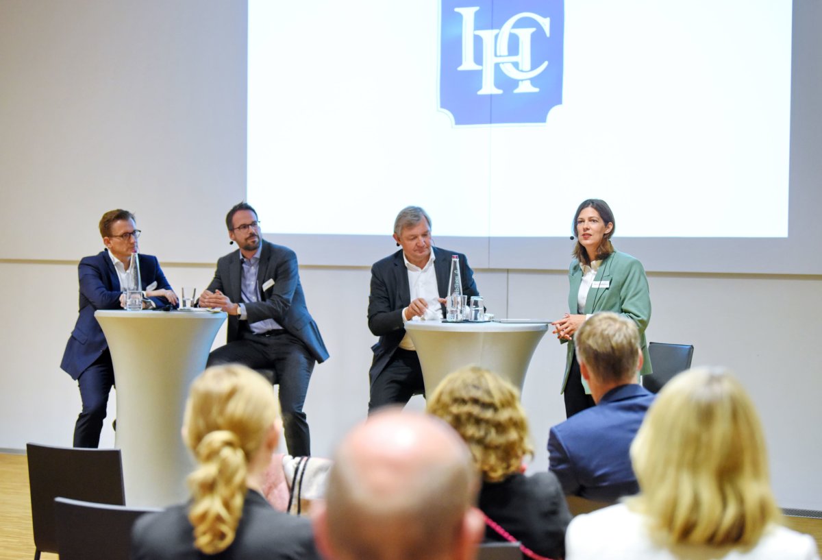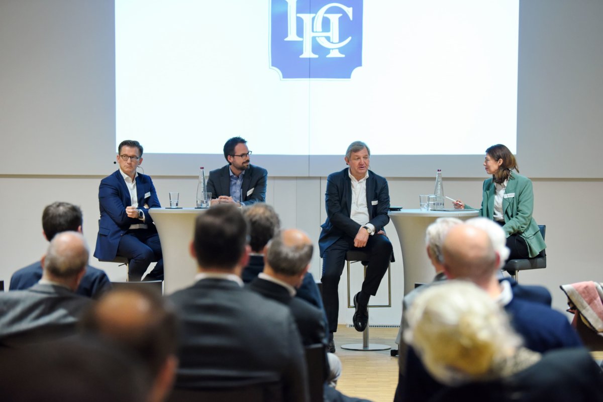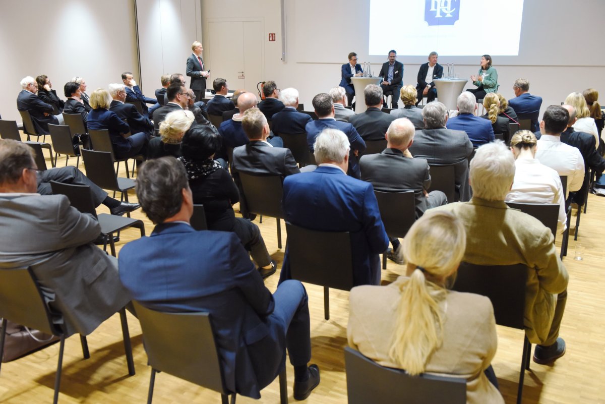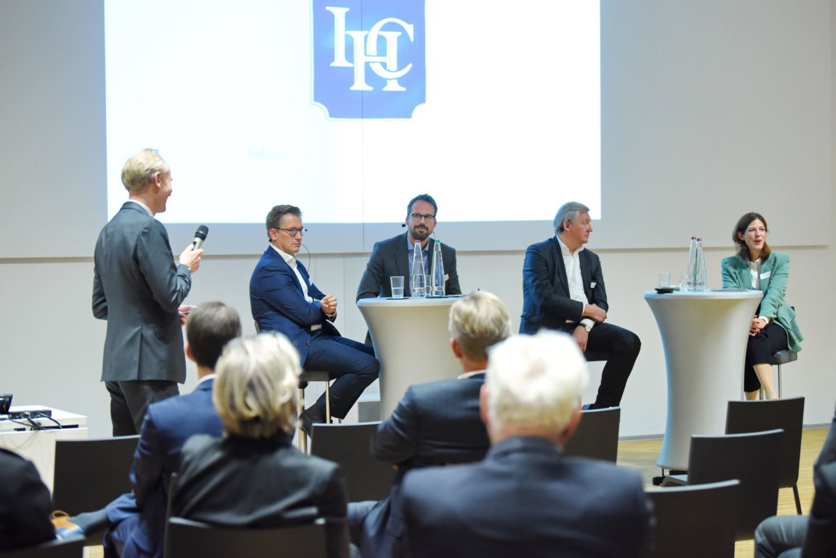 Im Goldbeck Forum auf dem Podium diskutierten Dr. Michael Meier (Egon Zehnder), Christopher Heine (CEO Hengst SE), Gastgeber des Abends Jörg-Uwe Goldbeck, Prof. Dr. Christina Hoon (Universität Bielefeld), Präsidiumsmitglied Dr. Harald Schlüter und Martin Krengel (Vorstandsvorsitzender WEPA Gruppe) ausführlich mit den Mitgliedern des IHC über das Thema Resilienz und Familienunternehmen.