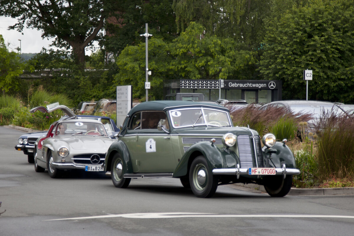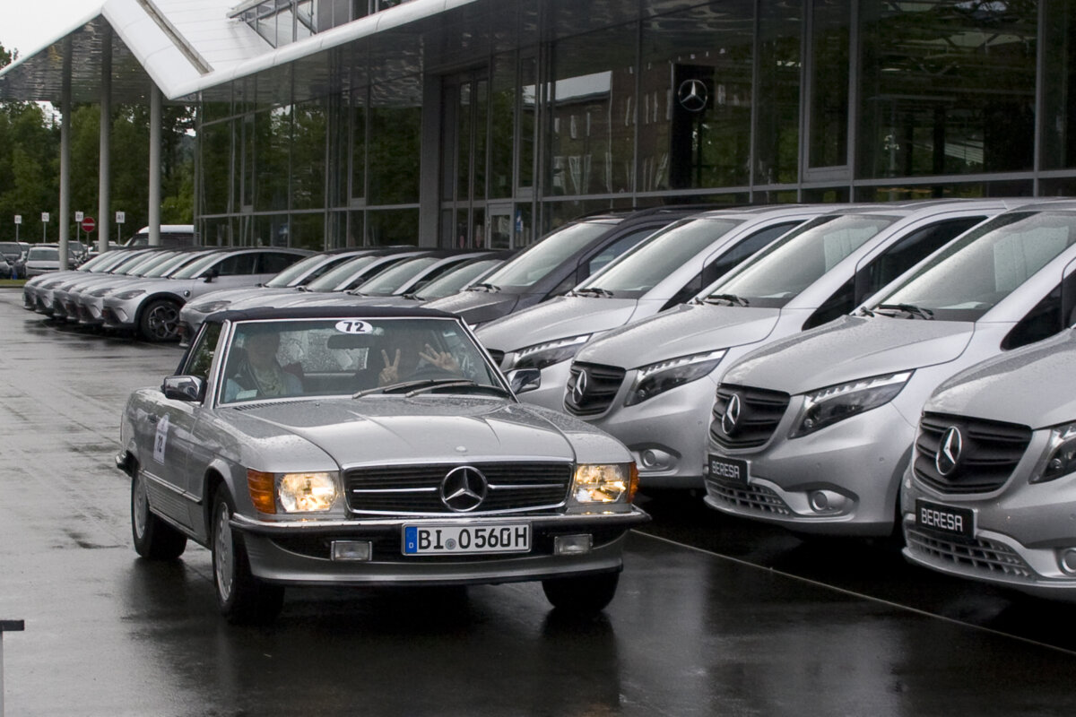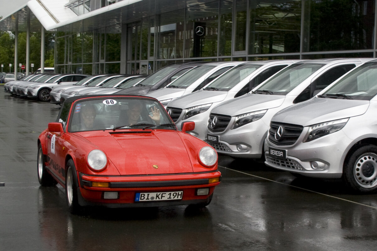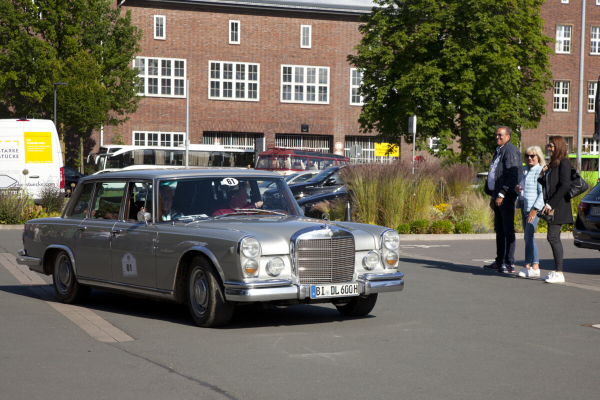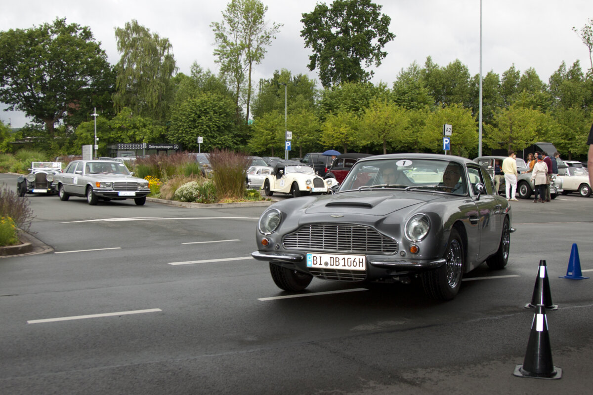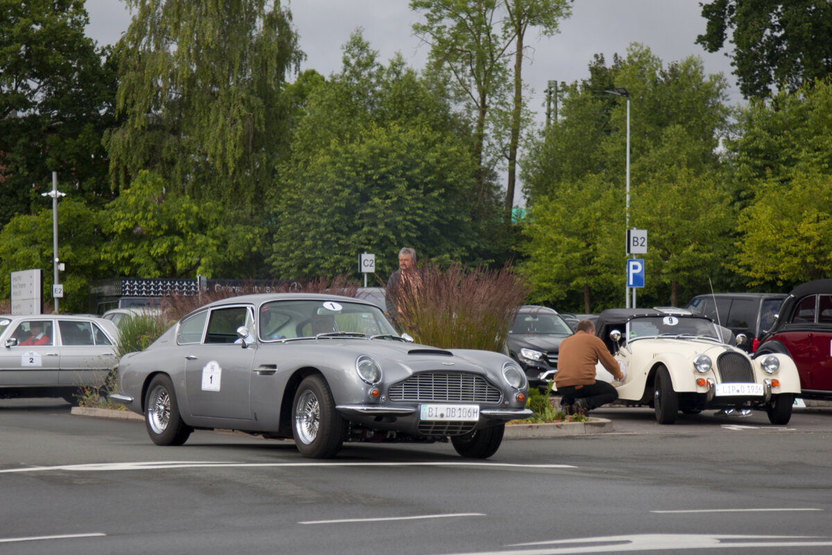 Rund 200 Kilometer ging es für die Fahrerinnen und Fahrern mit ihren 75 Oldtimern und Youngtimern in einem Parcours rund um Herford, vorbei an zahlreichen Schlössern und Gutshäusern und mitten durch die schönsten Landschaften. Die Route führte über Schloss Holtfeld, Schloss Brincke, Gut Böckel, Schloss Mühlenburg und Schloss Ulenburg nach Bad Oeynhausen, wo im GOP das Mittagessen eingenommen wurden. Nach der Pause ging es von dort über Haus Schadde, die Brennerei Begatal, Schloss Wendlinghausen, Schloss Brake, Lemgo Fußgängerzone und Schloss Iggenhausen wieder zurück nach Bielefeld. Mittlerweile hatte sich auch das Wetter etwas beruhigt.