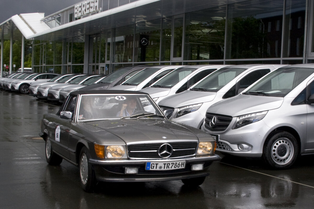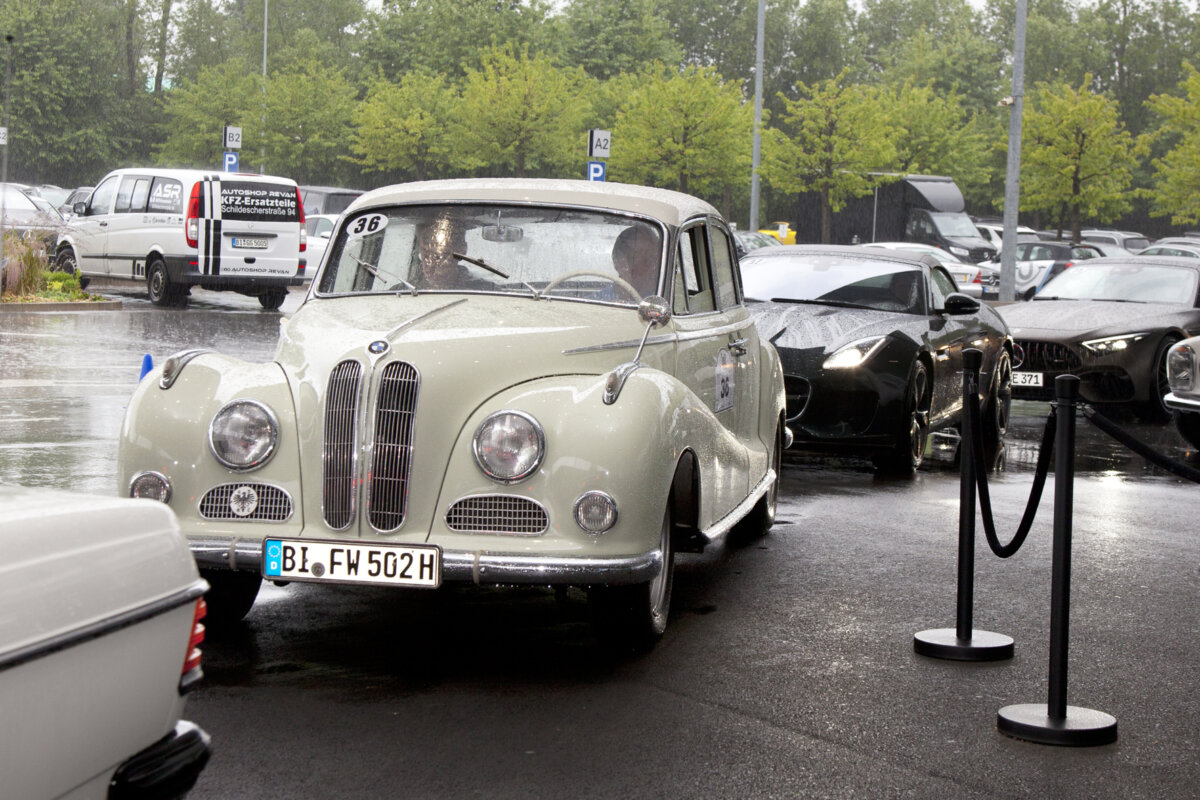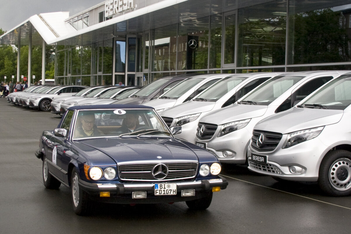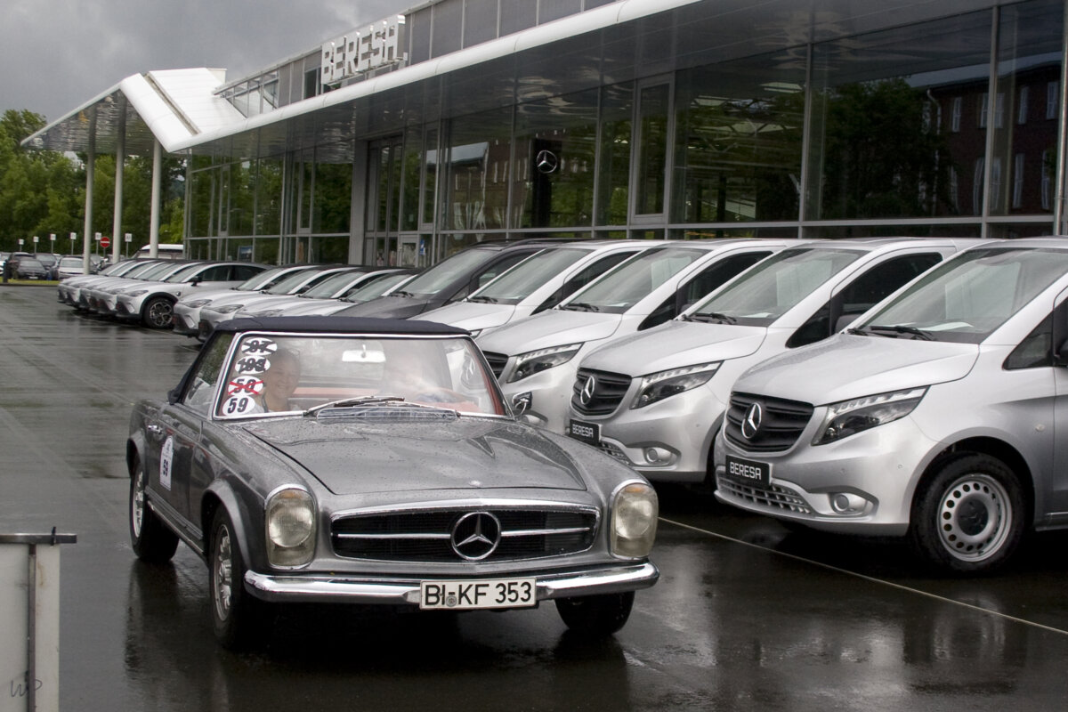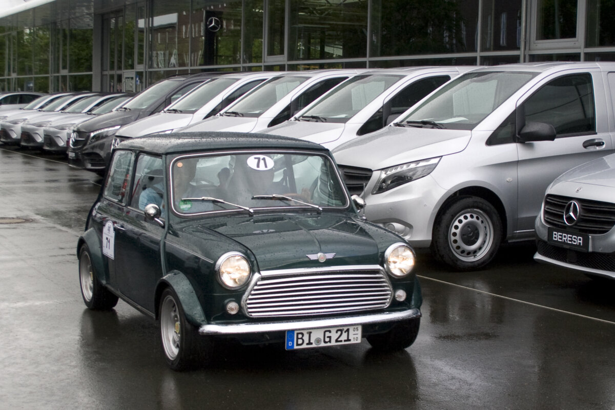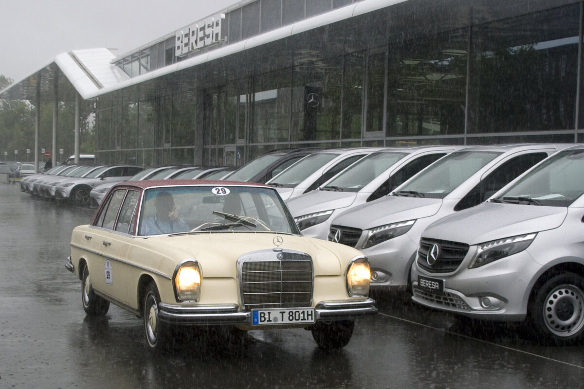 Rund 200 Kilometer ging es für die Fahrerinnen und Fahrern mit ihren 75 Oldtimern und Youngtimern in einem Parcours rund um Herford, vorbei an zahlreichen Schlössern und Gutshäusern und mitten durch die schönsten Landschaften. Die Route führte über Schloss Holtfeld, Schloss Brincke, Gut Böckel, Schloss Mühlenburg und Schloss Ulenburg nach Bad Oeynhausen, wo im GOP das Mittagessen eingenommen wurden. Nach der Pause ging es von dort über Haus Schadde, die Brennerei Begatal, Schloss Wendlinghausen, Schloss Brake, Lemgo Fußgängerzone und Schloss Iggenhausen wieder zurück nach Bielefeld. Mittlerweile hatte sich auch das Wetter etwas beruhigt.