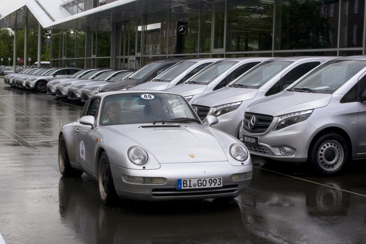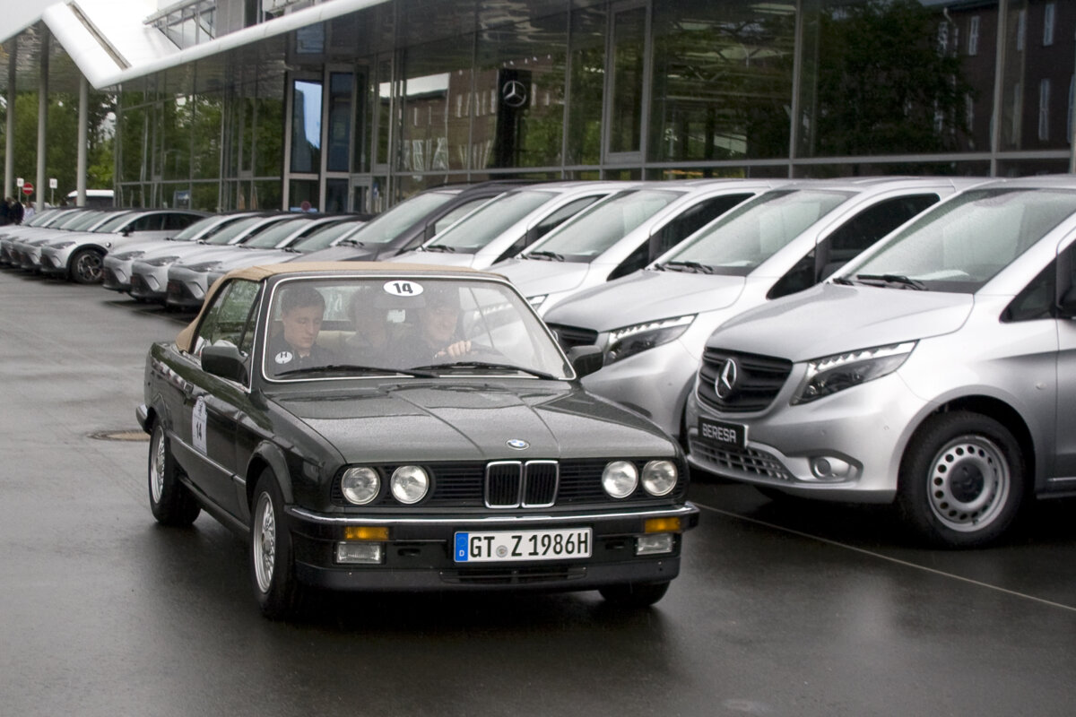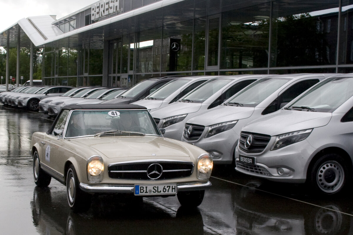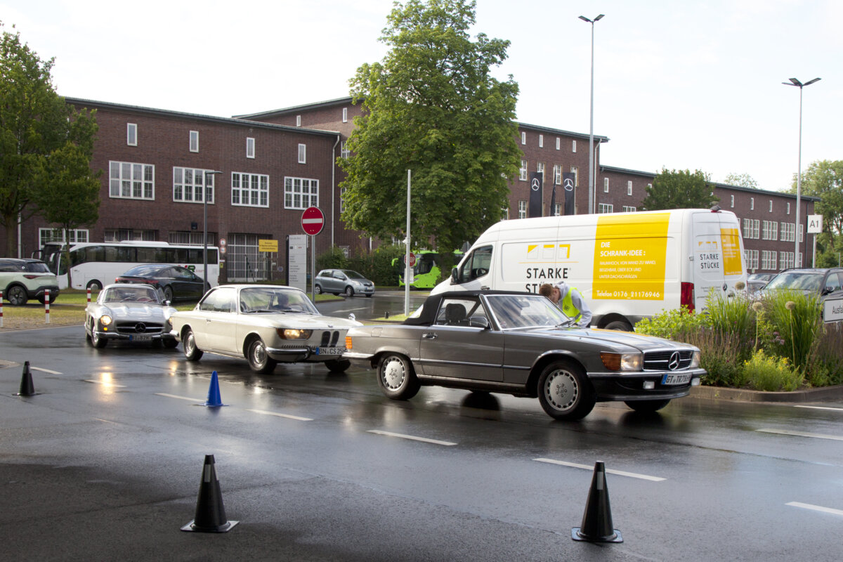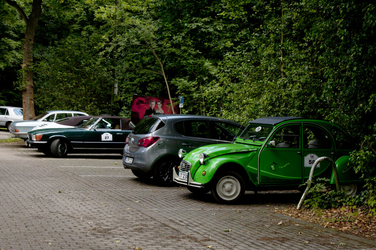 Rund 200 Kilometer ging es für die Fahrerinnen und Fahrern mit ihren 75 Oldtimern und Youngtimern in einem Parcours rund um Herford, vorbei an zahlreichen Schlössern und Gutshäusern und mitten durch die schönsten Landschaften. Die Route führte über Schloss Holtfeld, Schloss Brincke, Gut Böckel, Schloss Mühlenburg und Schloss Ulenburg nach Bad Oeynhausen, wo im GOP das Mittagessen eingenommen wurden. Nach der Pause ging es von dort über Haus Schadde, die Brennerei Begatal, Schloss Wendlinghausen, Schloss Brake, Lemgo Fußgängerzone und Schloss Iggenhausen wieder zurück nach Bielefeld. Mittlerweile hatte sich auch das Wetter etwas beruhigt.