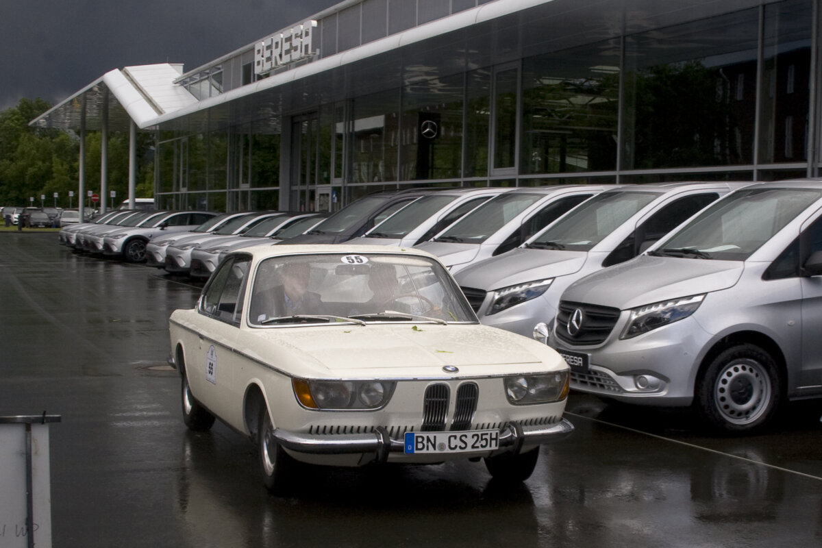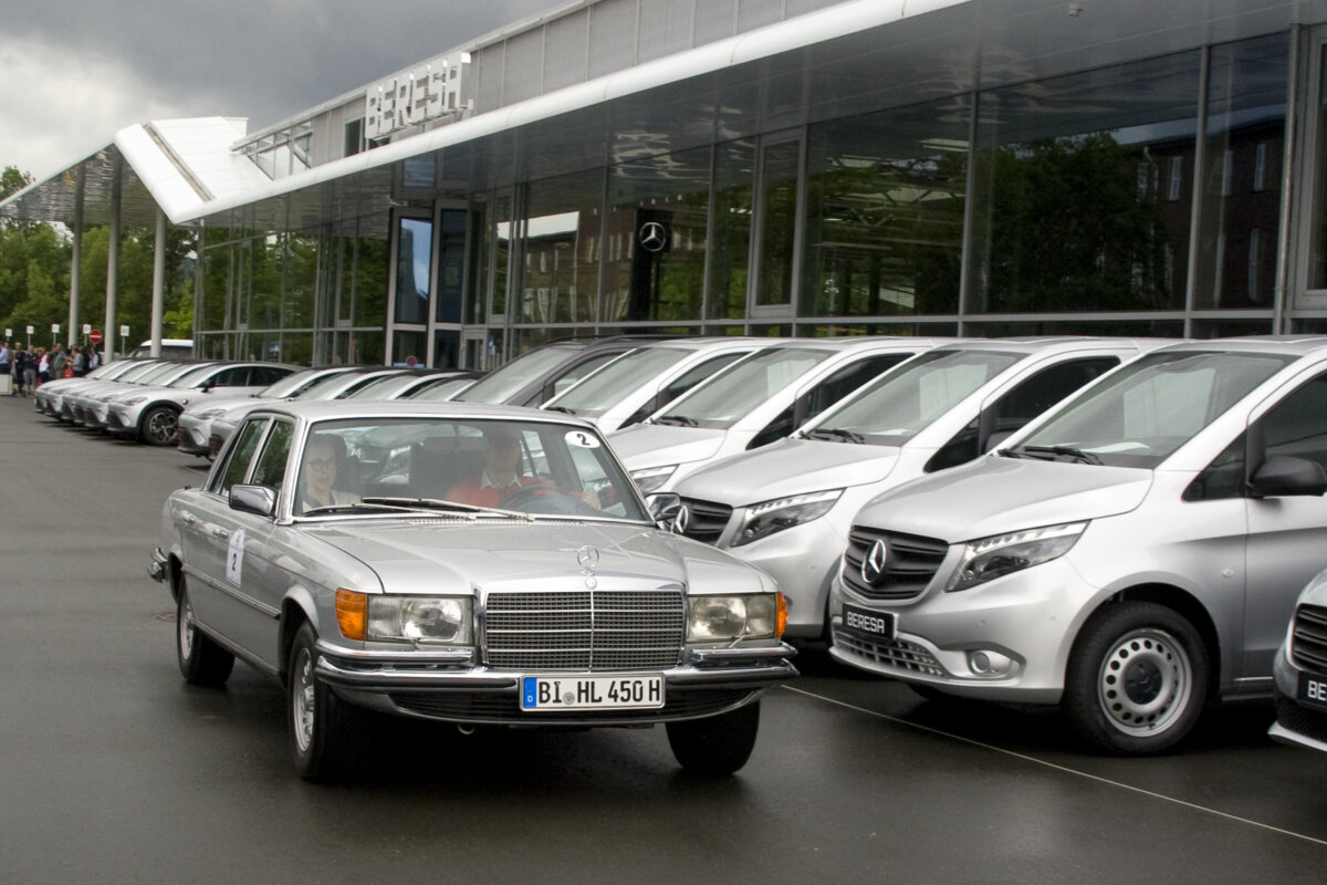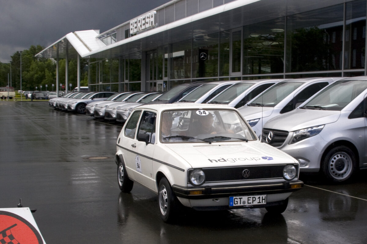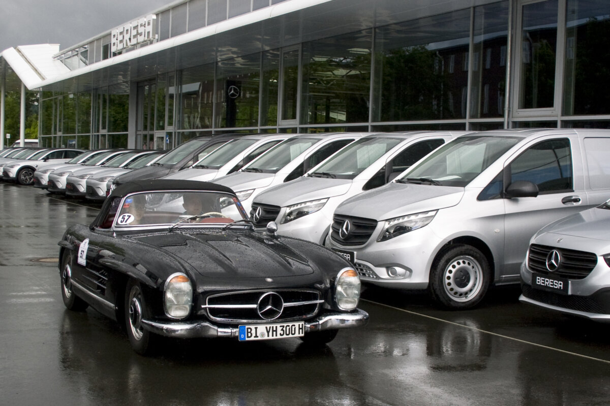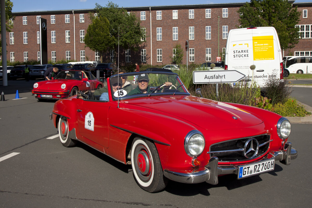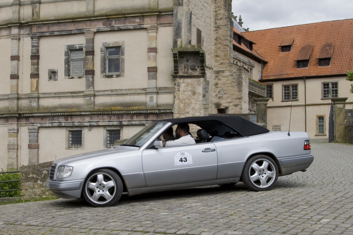 Rund 200 Kilometer ging es für die Fahrerinnen und Fahrern mit ihren 75 Oldtimern und Youngtimern in einem Parcours rund um Herford, vorbei an zahlreichen Schlössern und Gutshäusern und mitten durch die schönsten Landschaften. Die Route führte über Schloss Holtfeld, Schloss Brincke, Gut Böckel, Schloss Mühlenburg und Schloss Ulenburg nach Bad Oeynhausen, wo im GOP das Mittagessen eingenommen wurden. Nach der Pause ging es von dort über Haus Schadde, die Brennerei Begatal, Schloss Wendlinghausen, Schloss Brake, Lemgo Fußgängerzone und Schloss Iggenhausen wieder zurück nach Bielefeld. Mittlerweile hatte sich auch das Wetter etwas beruhigt.