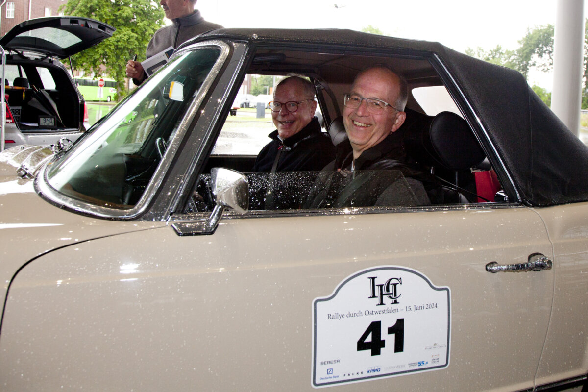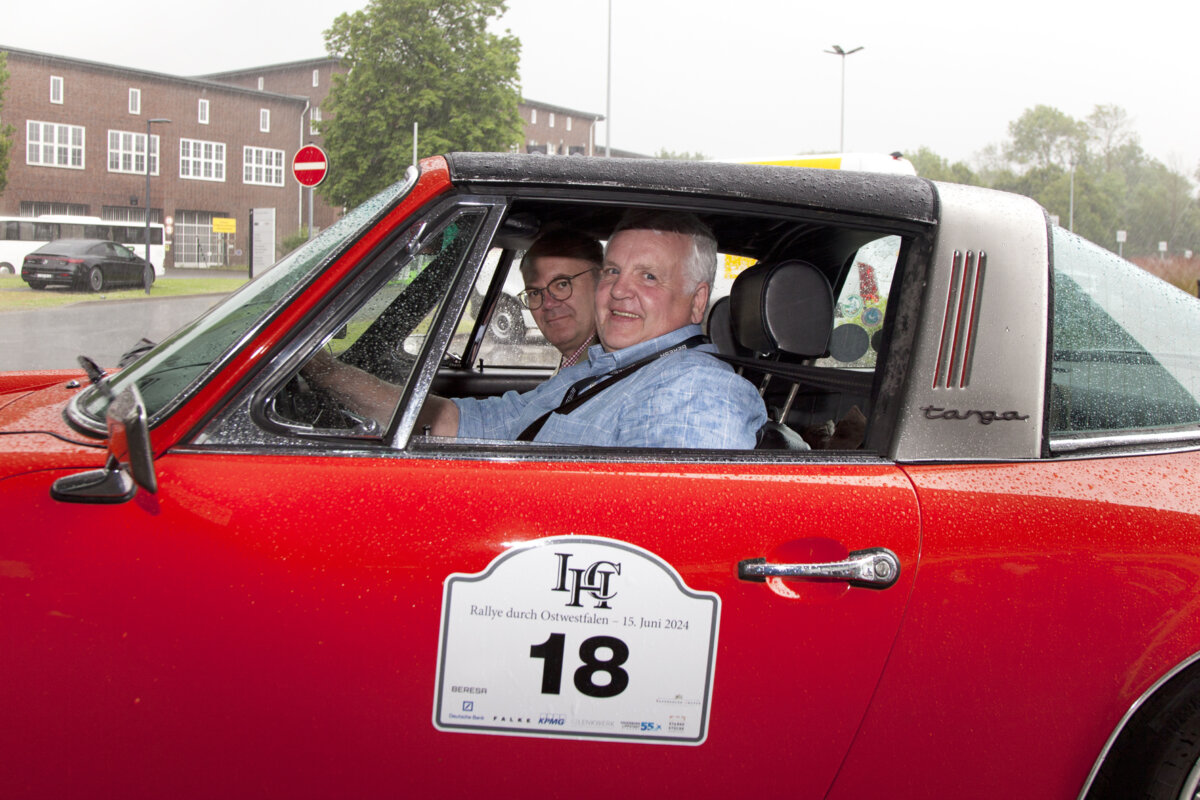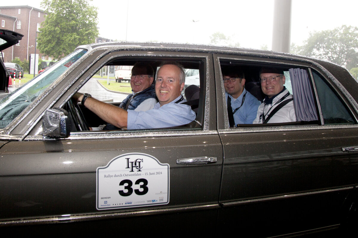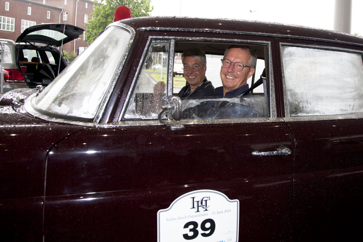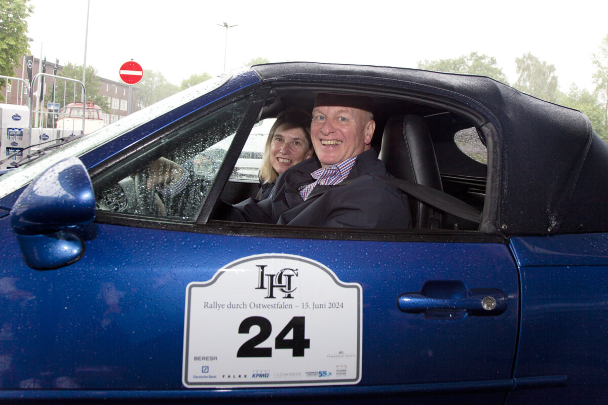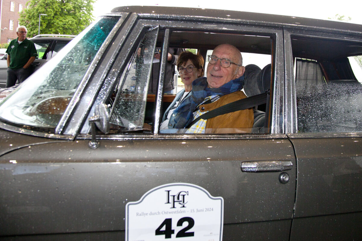 Der strömende Regen beim Start konnte niemandem die gute Laune verderben. Schon lange hatten sich die Teilnehmerinnen und Teilnehmer auf die 13. IHC-Rallye gefreut, die am 15. Juni 2024 stattfand. Pünktlich um 9.01 Uhr nach dem Frühstück rollte das erste Fahrzeug vom Start- und Zielpunkt Beresa in Bielefeld auf die Strecke.