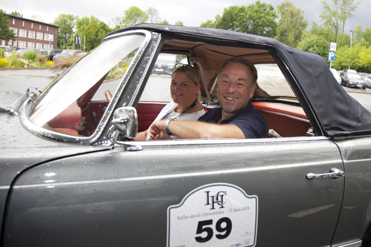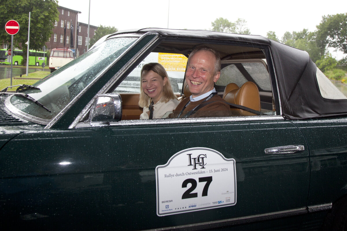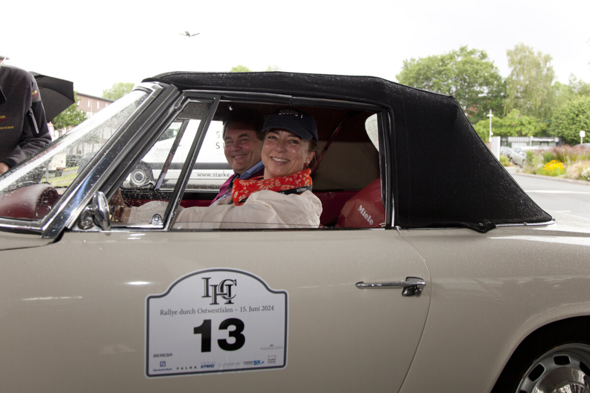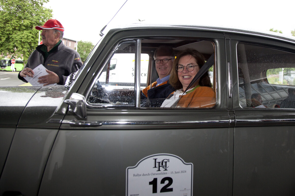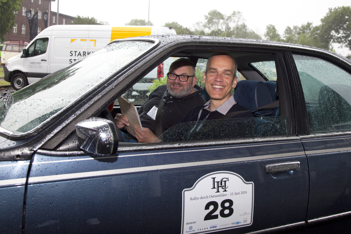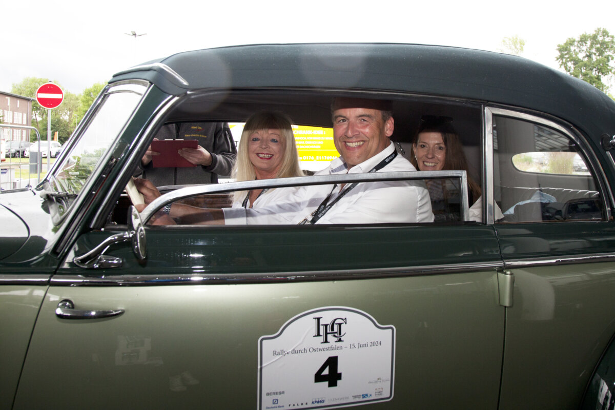 Der strömende Regen beim Start konnte niemandem die gute Laune verderben. Schon lange hatten sich die Teilnehmerinnen und Teilnehmer auf die 13. IHC-Rallye gefreut, die am 15. Juni 2024 stattfand. Pünktlich um 9.01 Uhr nach dem Frühstück rollte das erste Fahrzeug vom Start- und Zielpunkt Beresa in Bielefeld auf die Strecke.