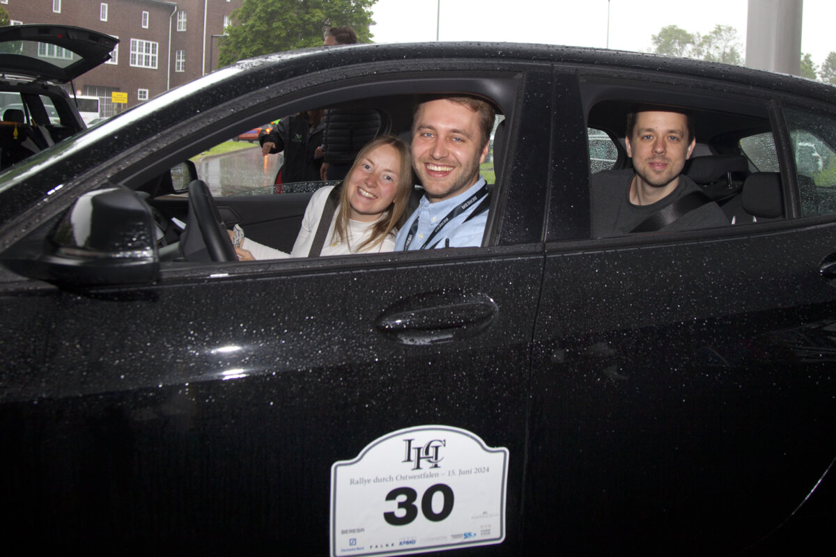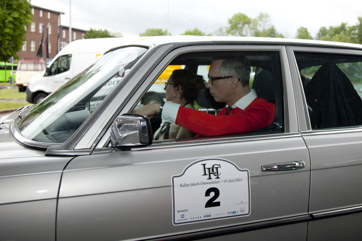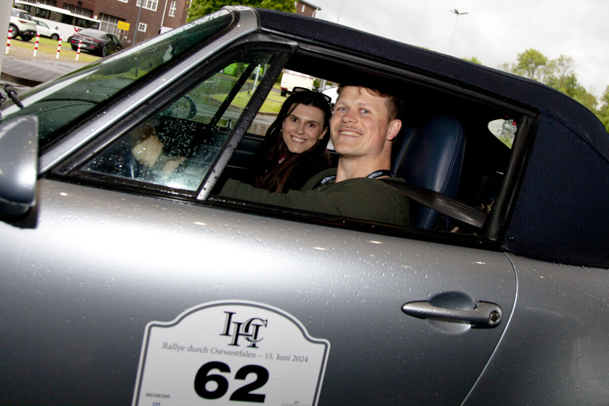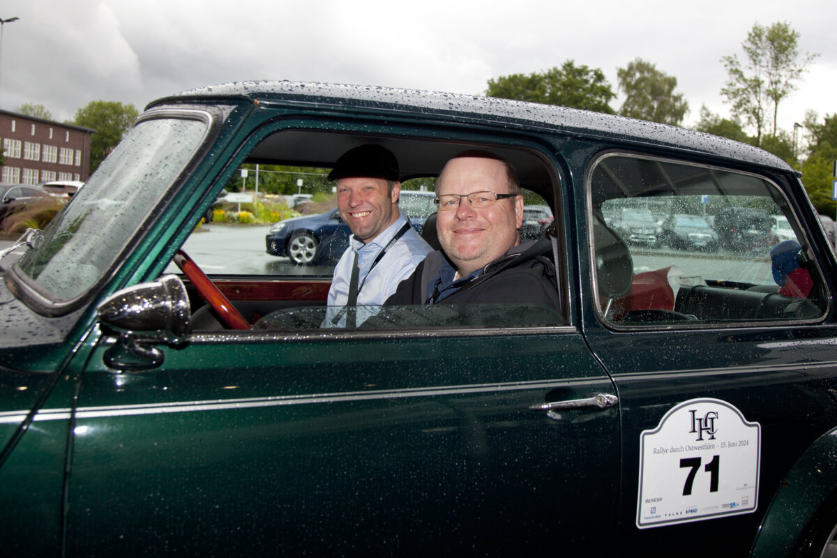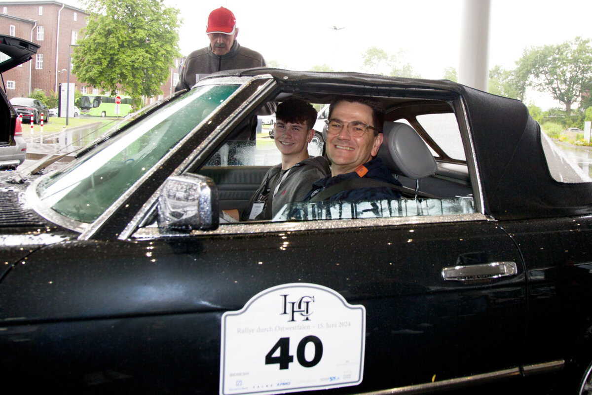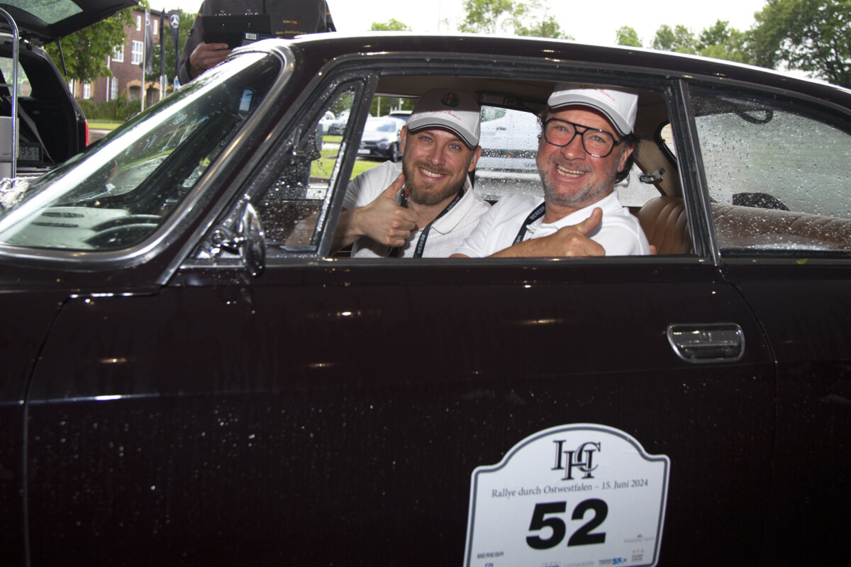 Der strömende Regen beim Start konnte niemandem die gute Laune verderben. Schon lange hatten sich die Teilnehmerinnen und Teilnehmer auf die 13. IHC-Rallye gefreut, die am 15. Juni 2024 stattfand. Pünktlich um 9.01 Uhr nach dem Frühstück rollte das erste Fahrzeug vom Start- und Zielpunkt Beresa in Bielefeld auf die Strecke.