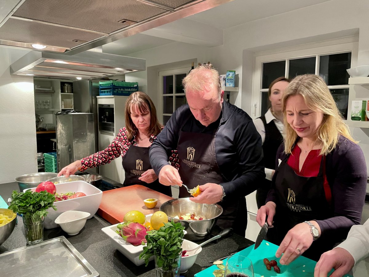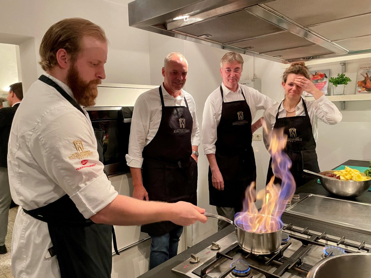 An diesem Abend stand kulinarisch ein raffiniertes Tapas-Buffet auf der To-do-Liste. Mit Tipps und Tricks aus der Profiküche wurde geschnippelt, gebraten, geschmort und flambiert. Das Wichtigste dabei: Beim gemeinsamen Kochen wird viel probiert, diskutiert und genossen. Das gemeinsame, aktive Erlebnis und die Verbundenheit standen damit bei dieser Veranstaltung im Fokus. Ein herzlicher Dank gilt dem gesamten Team der Hotel-Residence Klosterpforte.