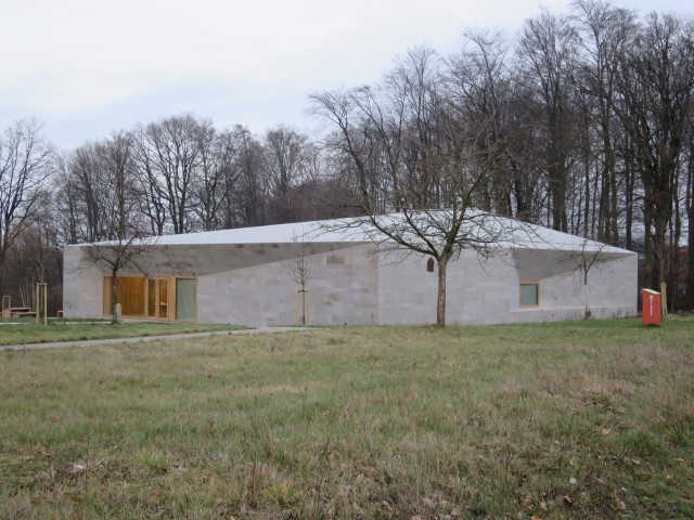 Der Neubau ist einem aus dem Erdreich ragenden Felsbrocken nachempfunden und soll sich so an die bäuerliche Umgebung anpassen. Dafür verwendeten die Architekten eine Fassade aus Muschelkalk, die den fließenden Übergang zwischen Außenwänden und Dachflächen unterstützen soll. Im Kontrast dazu sind alle Fenster, Möbel und Einbauten aus heimischem Eichenholz gefertigt. Die überdachten Außenbereiche sind zu den wichtigen Orten der Umgebung ausgerichtet. Neben Räumlichkeiten für aktuelle Ausstellungen und dem Museumscafé gibt es auch einen multifunktionalen Veranstaltungsraum, der für Events jeglicher Art genutzt werden kann.