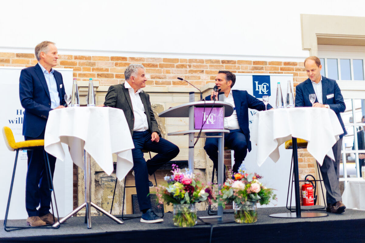 Mit dem Erfahrungswissen aus 100 Jahren Unternehmertum diskutieren anschließend der IHC-Präsident Eduard R. Dörrenberg (Dr. Wolff Group), Dr. Daniel Terberger (KATAG AG), Michael Böllhoff (Böllhoff Gruppe) und Jörg-Uwe Goldbeck (Goldbeck GmbH) die aktuelle wirtschaftliche Lage. Die vier Unternehmer machen in diesem Jahr „die magische 100 voll“: jeder von ihnen übernahm vor 25 Jahren in seinem Unternehmen Verantwortung.