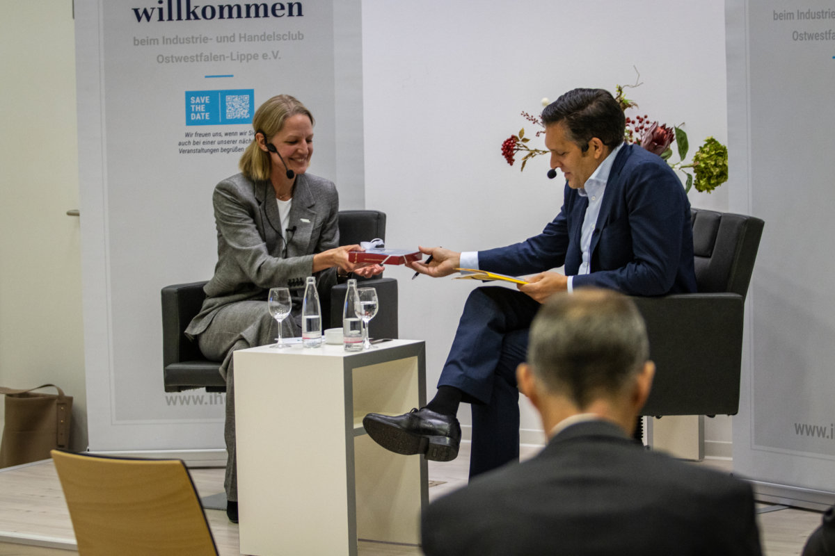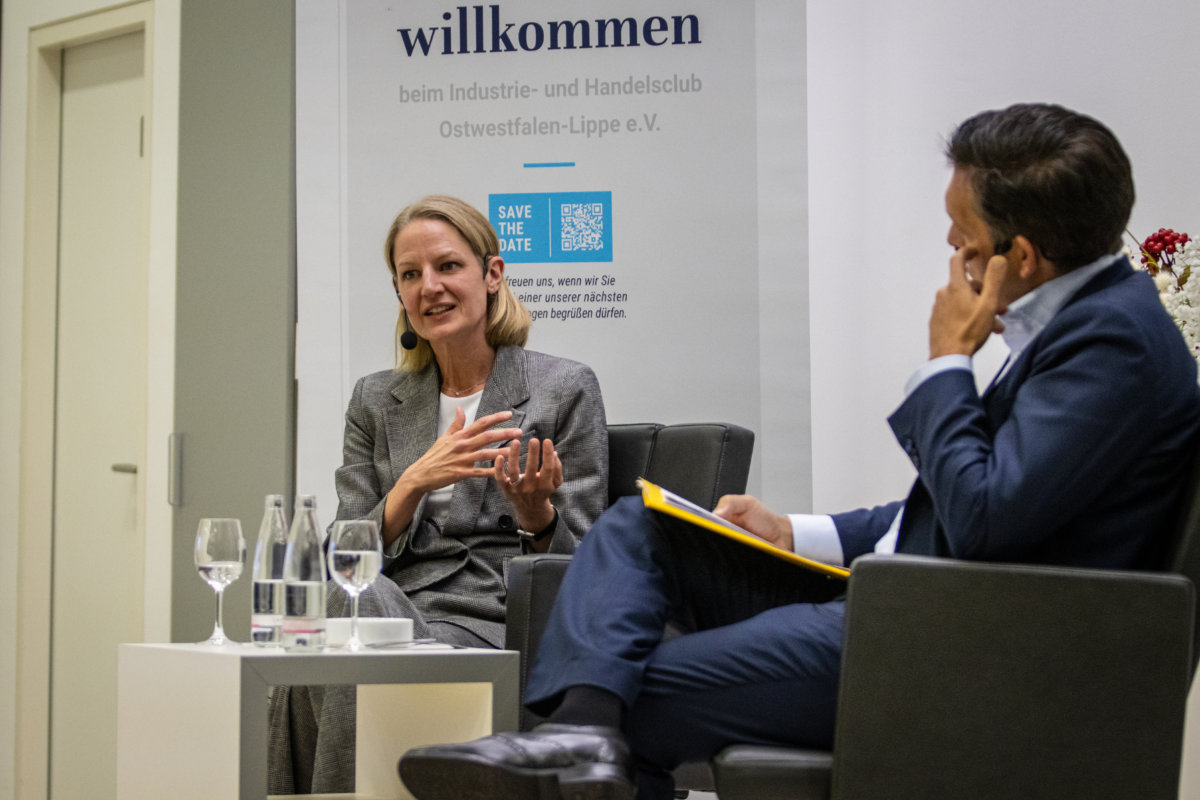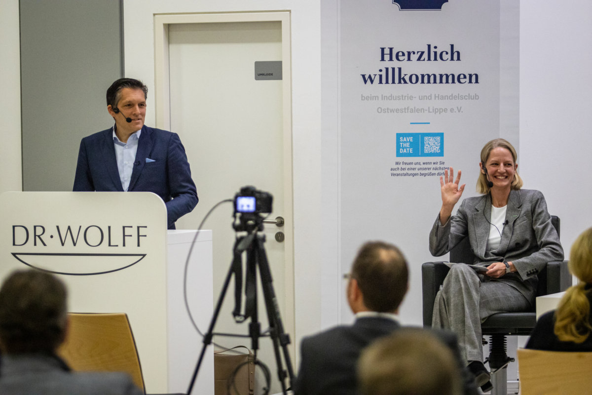 „Unternehmen und Gesellschaft sollten sich darauf einstellen, dass ein Freedom Day nicht kommen wird“. Mit diesen deutlichen Worten machte Gastrednerin Anna Maria Braun, Vorstandsvorsitzende der B. Braun Melsungen AG, gleich zu Beginn ihres Vortrags klar, wie sie die aktuelle Lage beurteilt. Auf Einladung des Industrie- und Handelsclubs OWL sprach die Juristin zum Thema „Von der Krise zur Chance – Wie wir den Wirtschaftsstandort Deutschland jetzt stärken können“. Der „Abend in bewegten Zeiten“, wie Gastgeber und IHC-Präsident Eduard R. Dörrenberg die Vortragsveranstaltung einleitete, fand als Hybridveranstaltung im Livestream und Präsenz im Dr. Wolff Institut in Bielefeld statt.