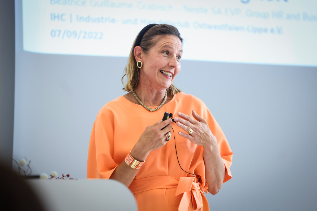 Béatrice Guillaume-Grabisch leitet seit 2019 die Bereiche Human Resources, Business Services und Informationstechnologie für die 276'000 Mitarbeitenden von Nestlé in 186 Ländern. Die Französin, die ausgezeichnet Deutsch spricht, war eigens aus Vevey, dem Nestlé-Stammsitz am Genfer See nach Bielefeld gereist, um auf Einladung von IHC-Präsident Eduard R. Dörrenberg im Dr. Wolff-Institut zu referieren.