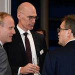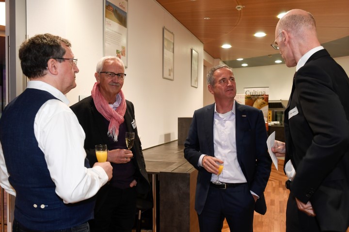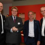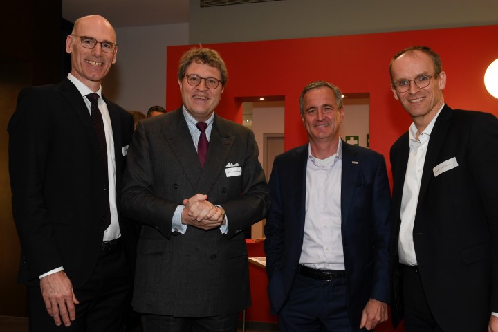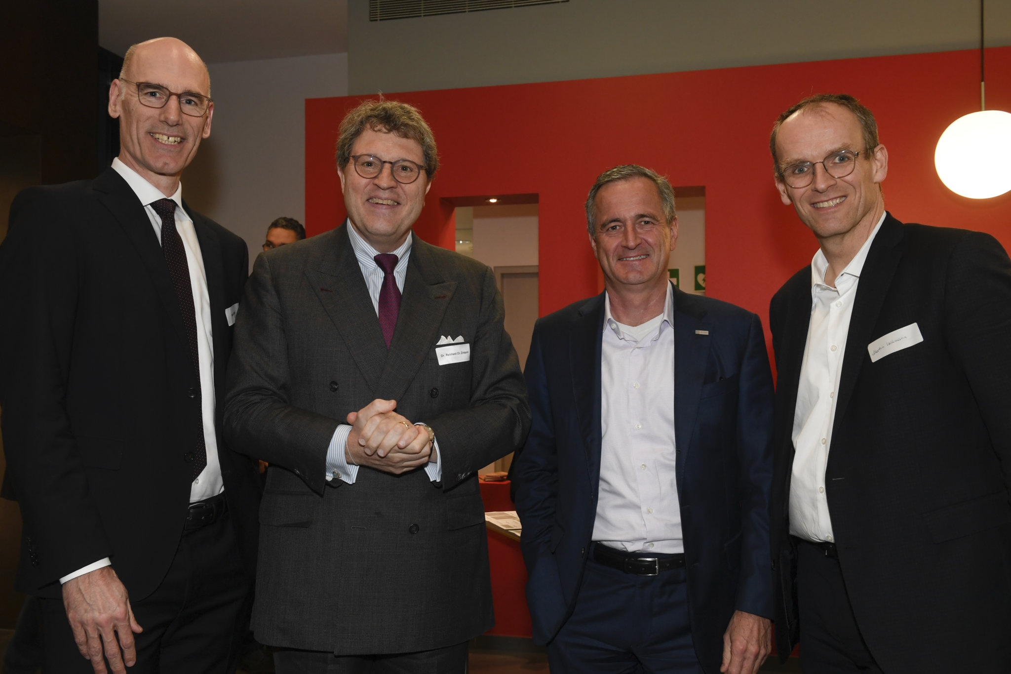 EnBW zu Gast bei den Stadtwerken Bielefeld: Die Geschäftsführer der Stadtwerke Bielefeld Rainer Müller (l.) und Martin Uekmann (r.) begrüßen gemeinsam mit dem IHC Präsidenten Dr. Reinhard Ch. Zinkann den Referenten des Abends, Dr. Frank Mastiaux