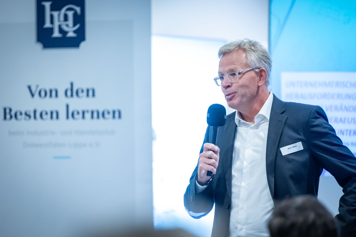 Wie vereinbart man Tradition und Innovation? Diese Frage treibt viele Familienunternehmen um. In seinem Vortrag vor Mitgliedern und Gästen des Industrie- und Handelsclubs OWL, gab der CEO und Vorsitzende der Geschäftsführung der Heraeus Gruppe, Jan Rinnert, Einblicke in die strategische Ausrichtung eines der größten deutschen Familienunternehmen. Auf Vermittlung von IHC Ehrenpräsident Dr. Reinhard Zinkann konnte IHC Präsident Eduard R. Dörrenberg den Manager Anfang September in den Räumen der Deutschen Bank in Bielefeld begrüßen.