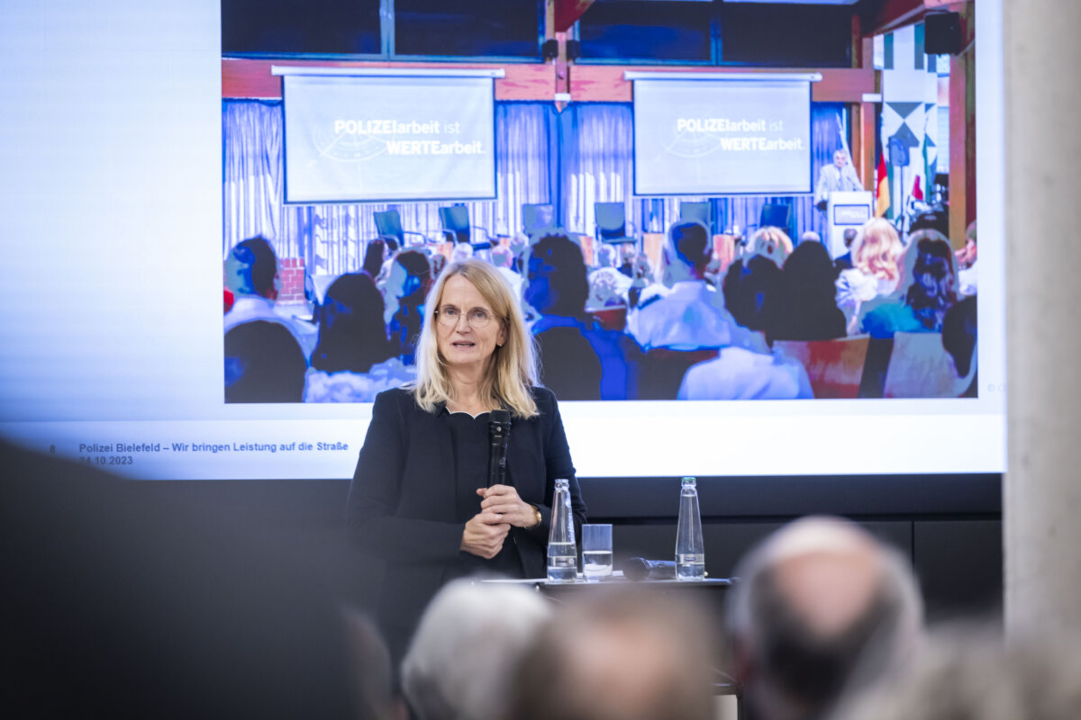 Trotz eines oft schwierigen und mitunter auch belastenden Arbeitsumfeldes warb die Behördenleiterin auch für die Polizei als Arbeitgeber. Mit ihrem Eintreten für Gerechtigkeit und Sicherheit leiste die Polizei „Wertearbeit an der Gesellschaft“, so Sandra Müller-Steinhauer. Mit dieser „Sinnhaftigkeit“ könne man gerade bei der „Generation Z“ punkten, so die Polizeipräsidentin, denn viele junge Menschen suchten in der Arbeit mehr als nur ein Mittel zum Geldverdienen. Die aktuellen Ausbildungszahlen spiegeln dies durchaus wider. So stellte die nordrhein-westfälische Polizei ab 1. September 3.000 Anwärterinnen und Anwärter ein – so viele wie noch nie.