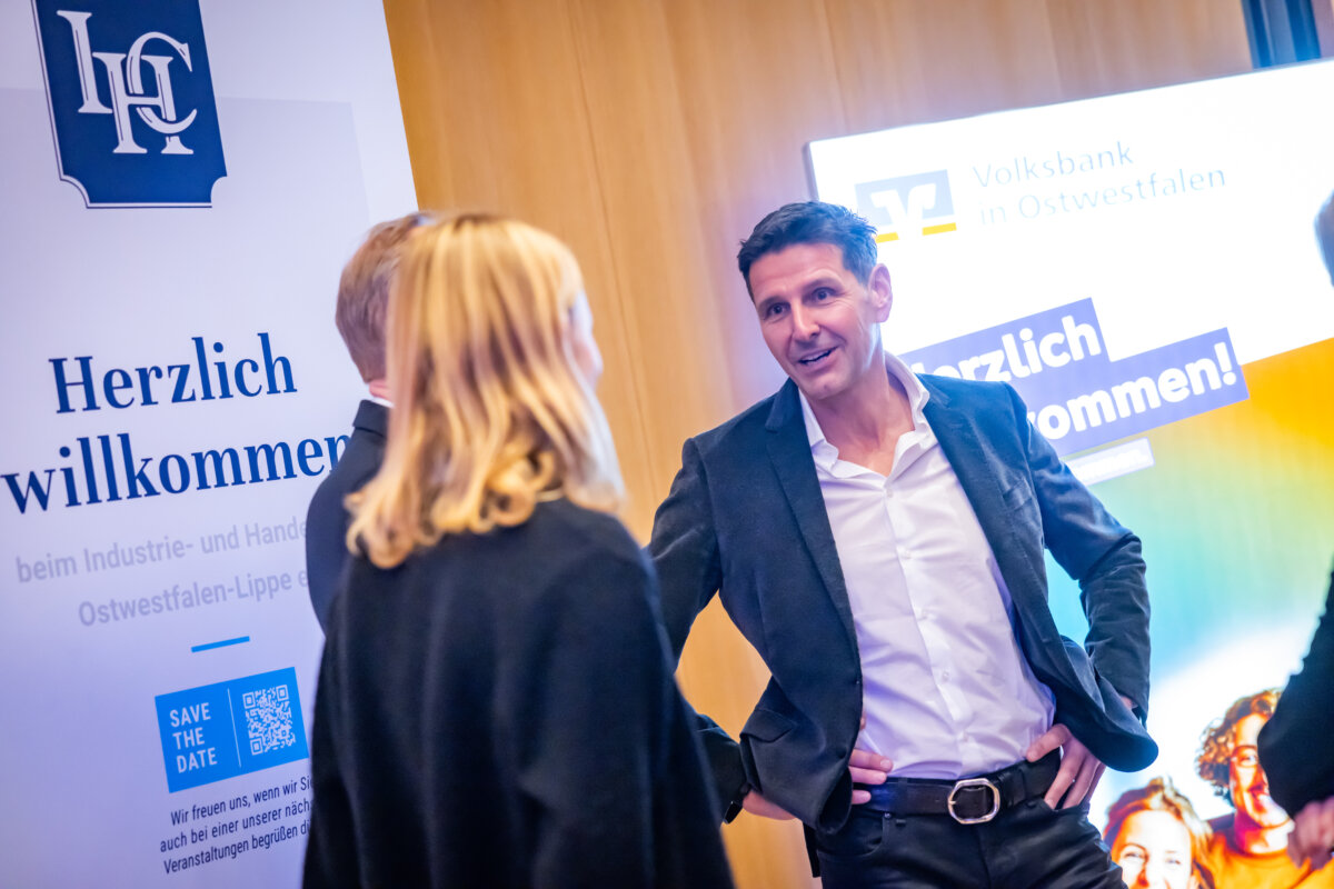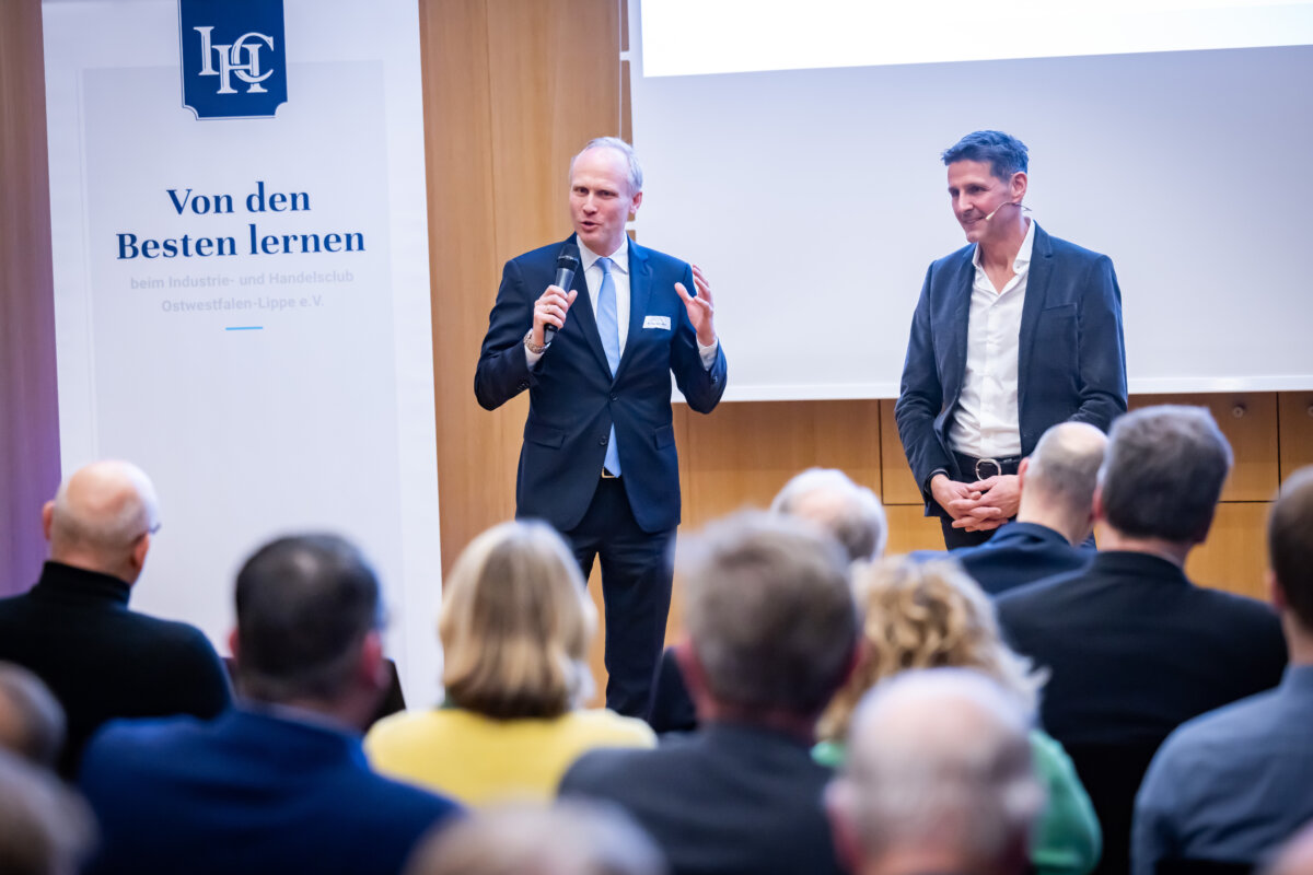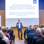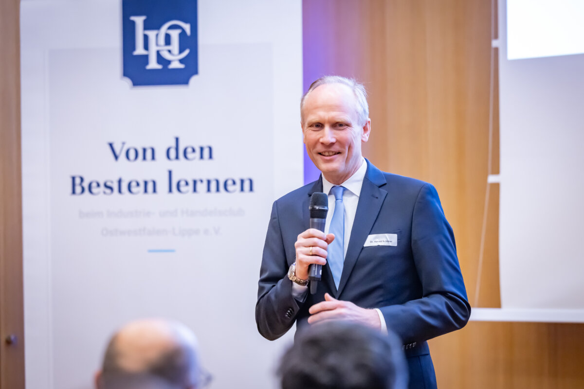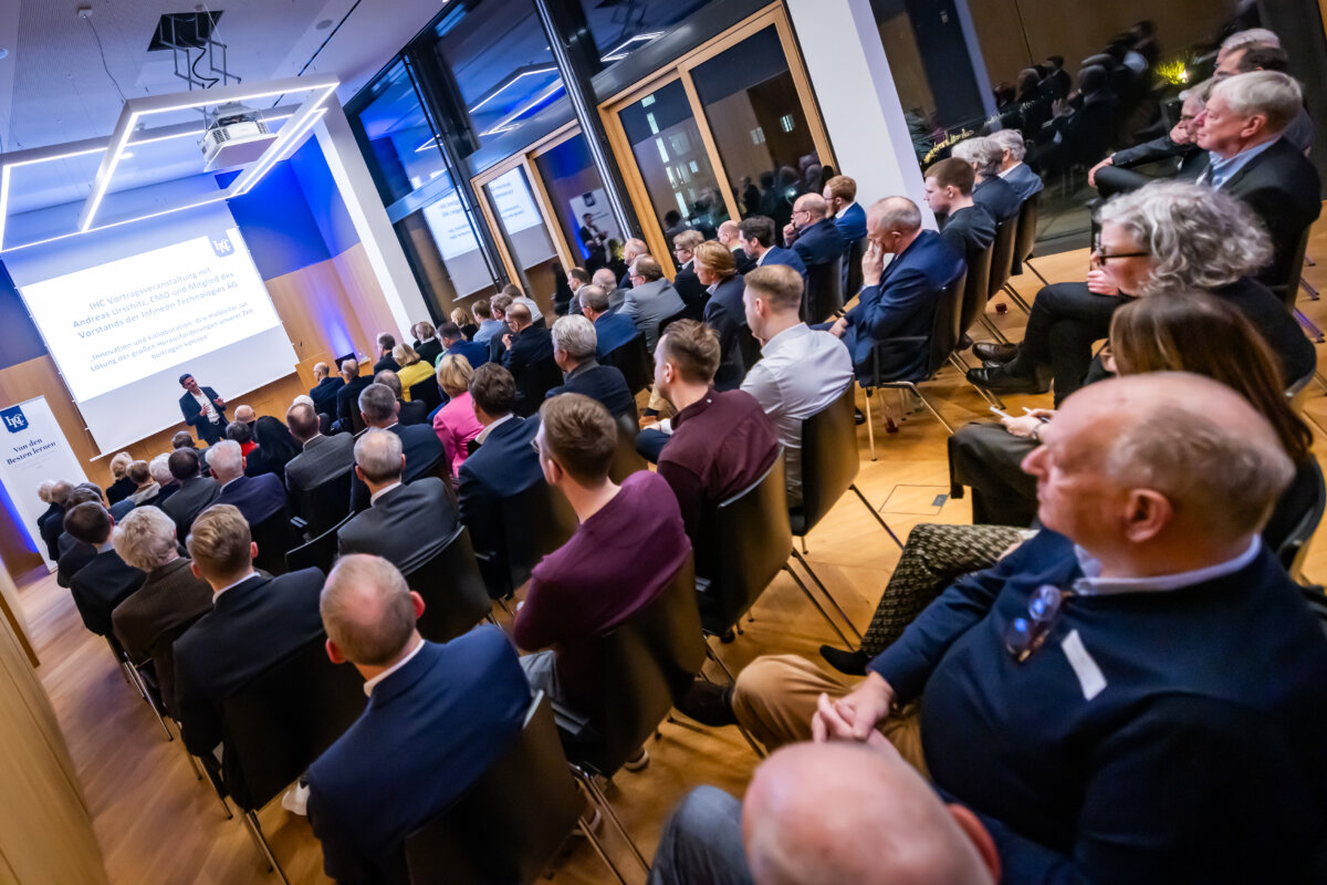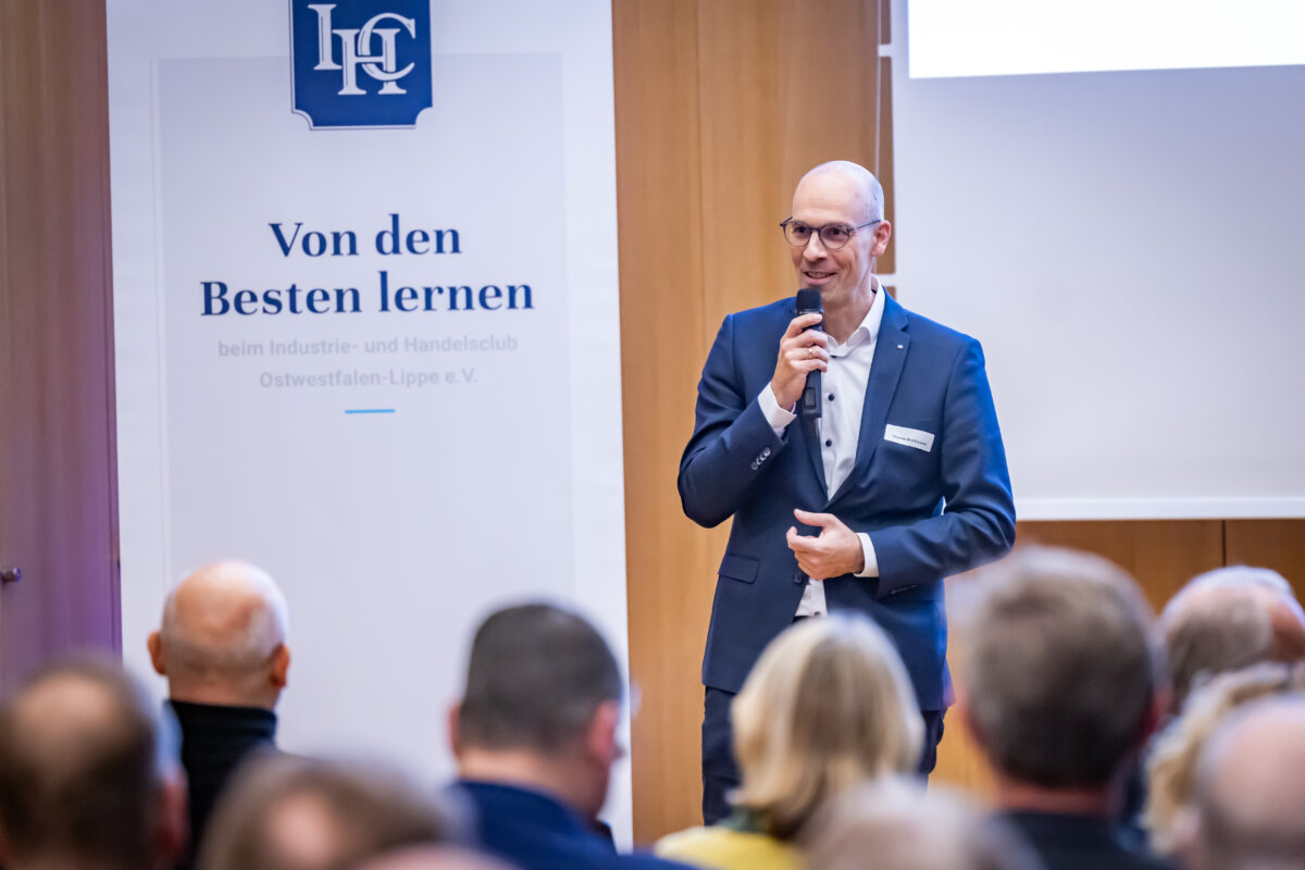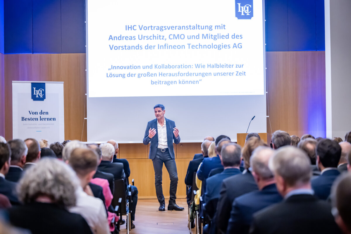 „Das war ein fantastischer Start: eine richtige Neujahrsansprache!“, fasste IHC Präsidiumsmitglied Dr. Harald Schlüter erfreut die erste Vortrags- und Diskussionsveranstaltung des Industrie- und Handelsclubs OWL zusammen. Gastredner in den Räumen der „Volksbank in Ostwestfalen“ am Bielefelder Kesselbrink war Andreas Urschitz. Der Manager ist Mitglied des Vorstands von Infineon Technologies AG und als Chief Marketing Officer seit 2022 verantwortlich für das Marketing des Konzerns. Der deutsche Halbleiterhersteller entstand im Jahr 1999 durch die Ausgliederung des Halbleitergeschäfts von Siemens. Mit rund 58.000 Mitarbeitern erzielte Infineon im Geschäftsjahr 2024 einen Umsatz von 14,96 Milliarden Euro.