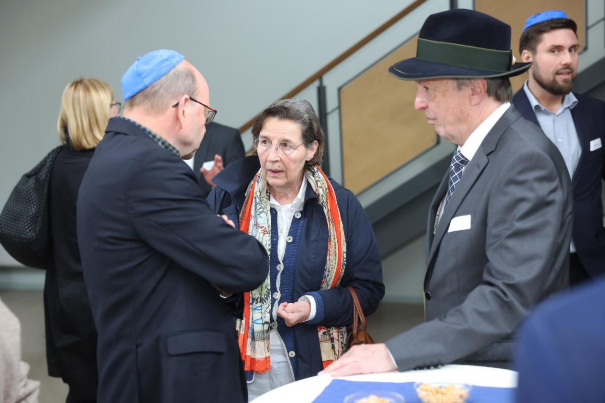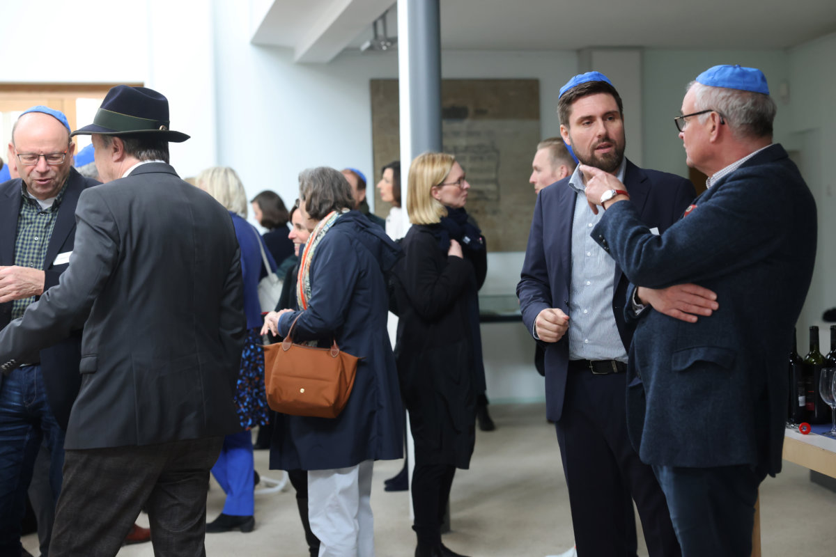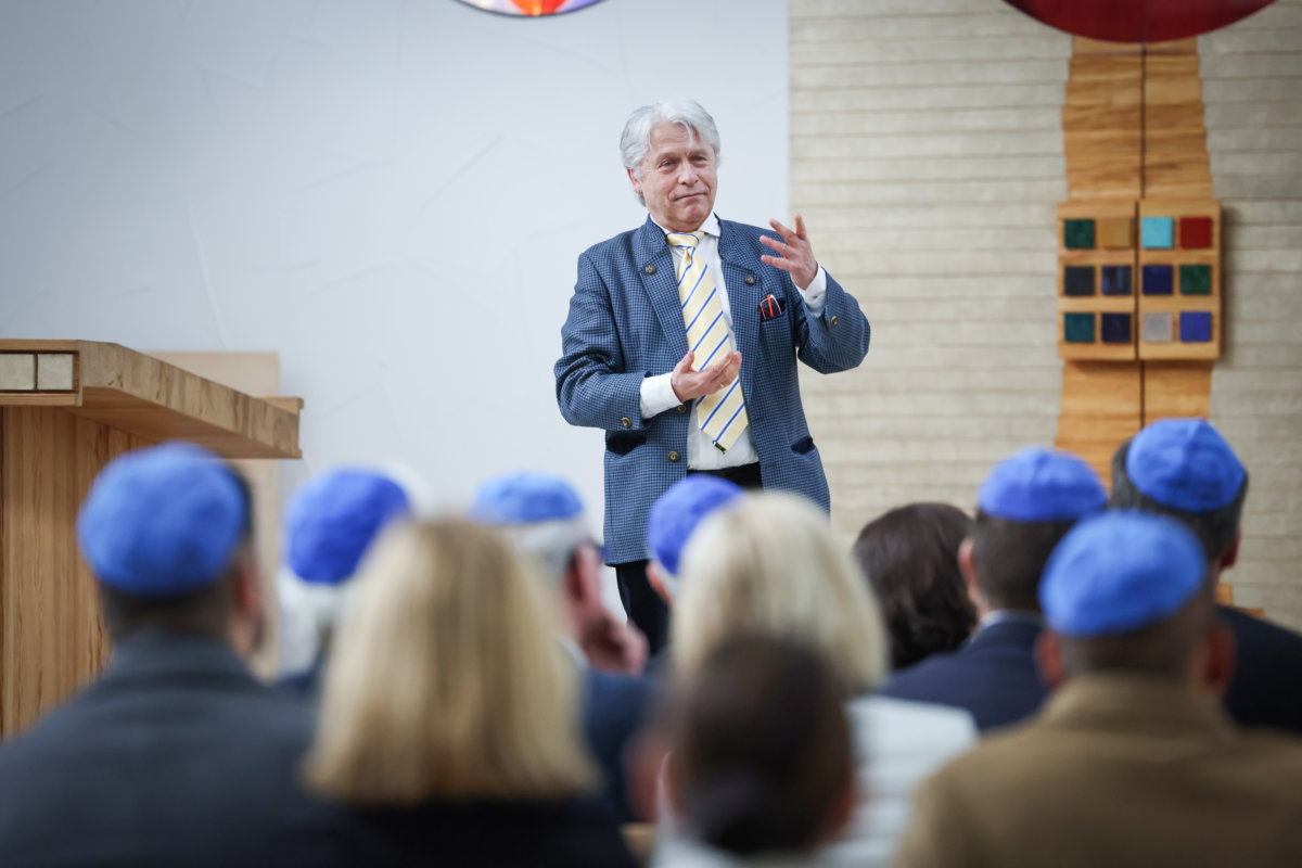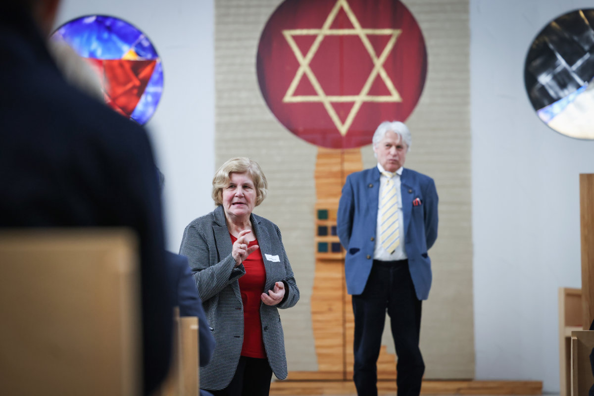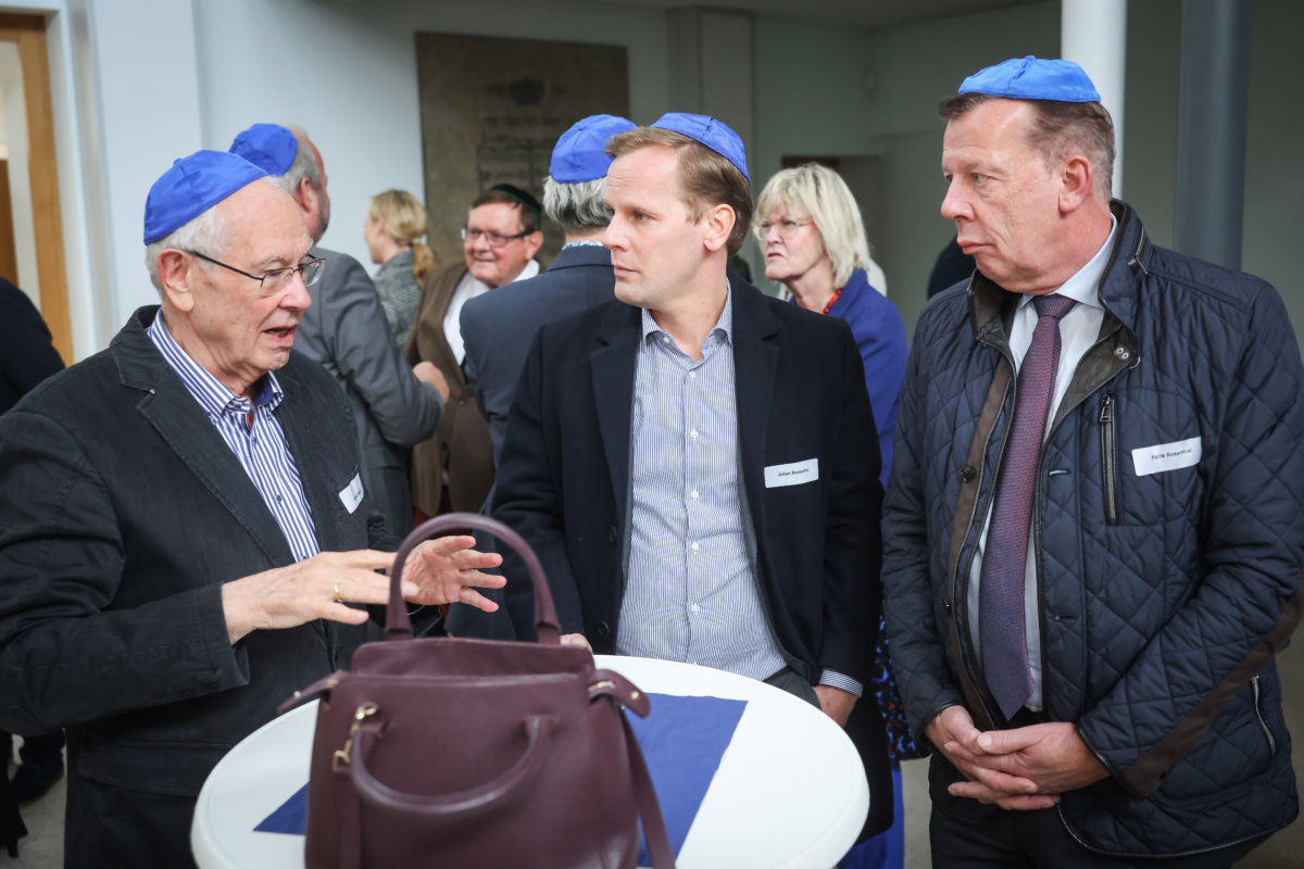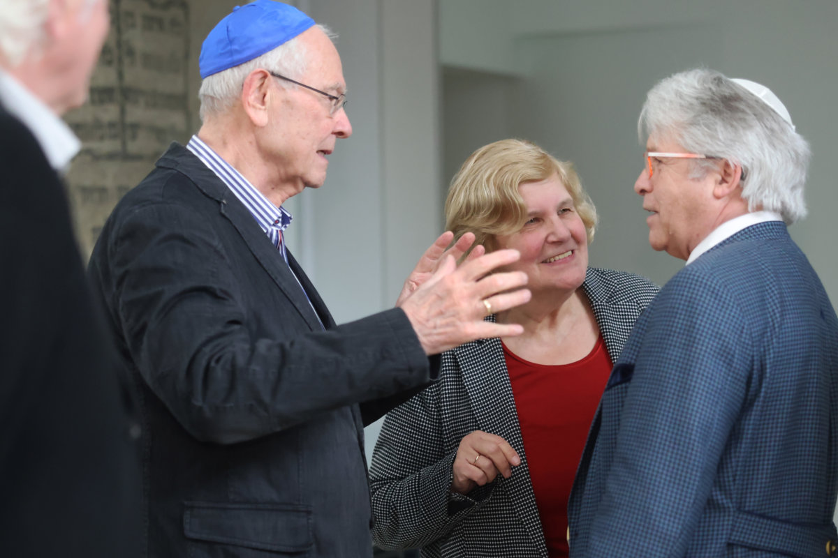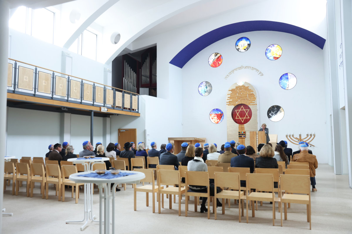 Vor dem abschließenden informellen Austausch bei koscherem Wein stellte Kantor Paul Yuval Adam die baulichen Veränderungen an der ehemaligen evangelischen Paul-Gerhardt-Kirche vor. Sie wurde 2008 zur Synagoge umgebaut. „Wir fühlen uns in der Nachbarschaft und Stadtgesellschaft gut aufgehoben“, erklärte Irith Michelsohn abschließend. Dennoch stehe die Synagoge zum Schutz vor antisemitischer Gewalt ständig unter Polizeischutz. Ein Besuch für Nicht-Gemeindemitglieder ist nur nach Anmeldung und Taschenkontrolle möglich. „Mein Wunsch für die Zukunft wäre mehr Normalität“, so die Gemeindevorsitzende. „Ich möchte gern einmal zu spät zum Gottesdienst kommen können, ohne vorher an der Tür klingeln zu müssen“.