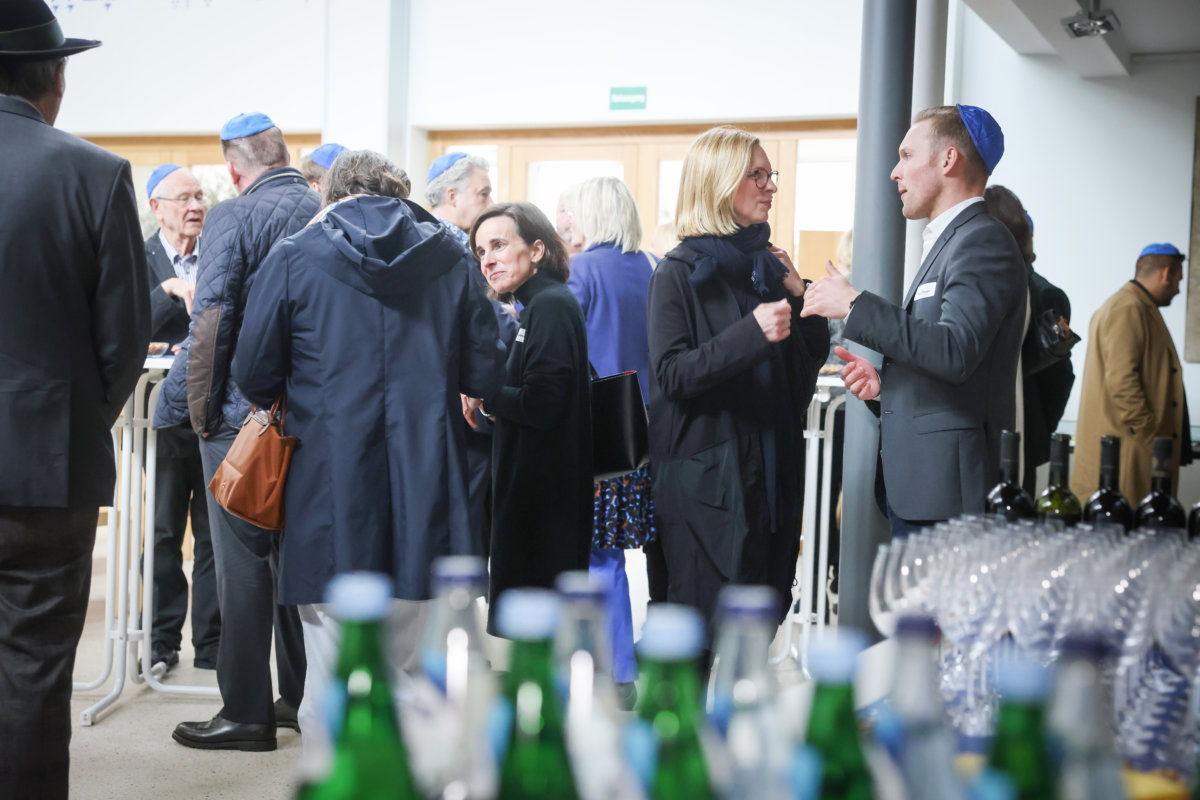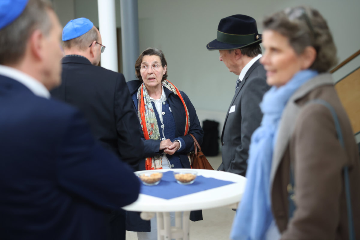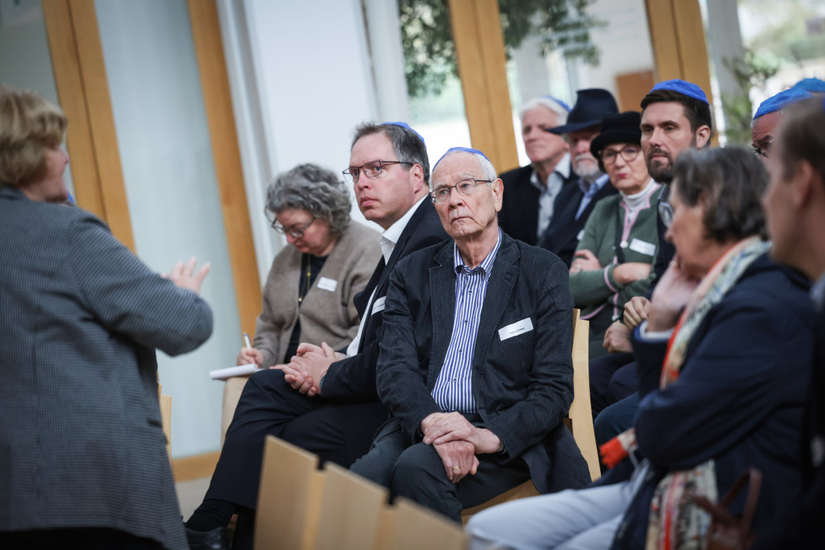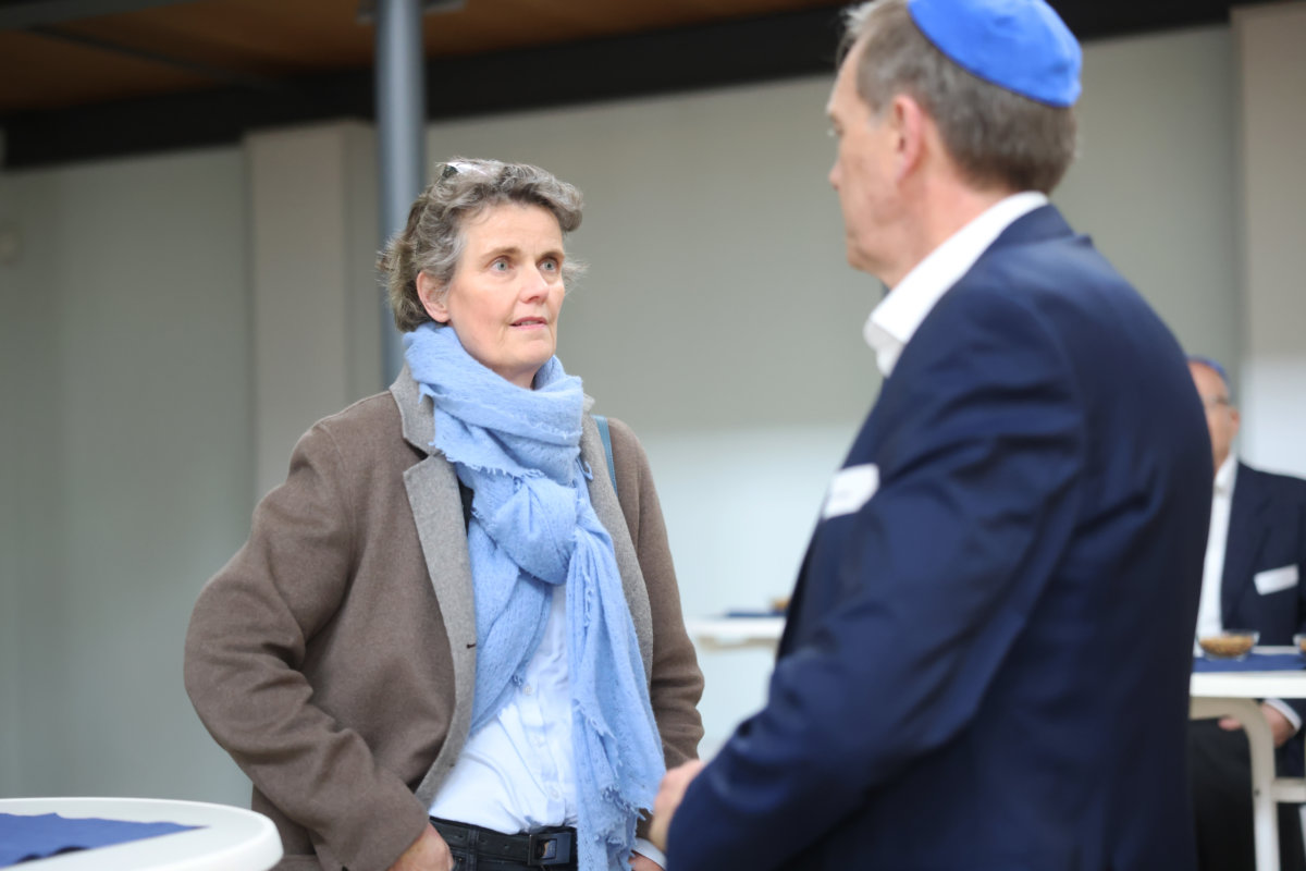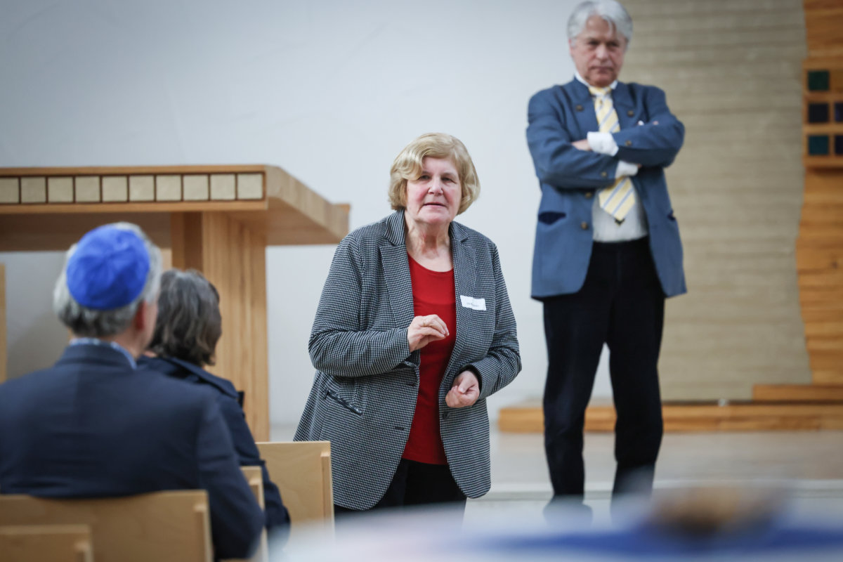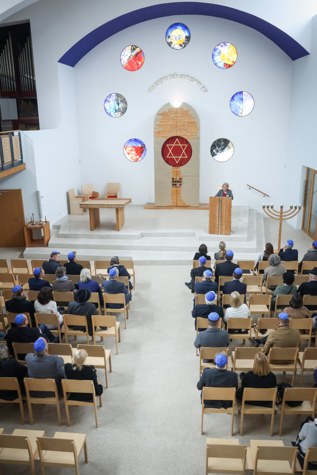 Vor dem abschließenden informellen Austausch bei koscherem Wein stellte Kantor Paul Yuval Adam die baulichen Veränderungen an der ehemaligen evangelischen Paul-Gerhardt-Kirche vor. Sie wurde 2008 zur Synagoge umgebaut. „Wir fühlen uns in der Nachbarschaft und Stadtgesellschaft gut aufgehoben“, erklärte Irith Michelsohn abschließend. Dennoch stehe die Synagoge zum Schutz vor antisemitischer Gewalt ständig unter Polizeischutz. Ein Besuch für Nicht-Gemeindemitglieder ist nur nach Anmeldung und Taschenkontrolle möglich. „Mein Wunsch für die Zukunft wäre mehr Normalität“, so die Gemeindevorsitzende. „Ich möchte gern einmal zu spät zum Gottesdienst kommen können, ohne vorher an der Tür klingeln zu müssen“.