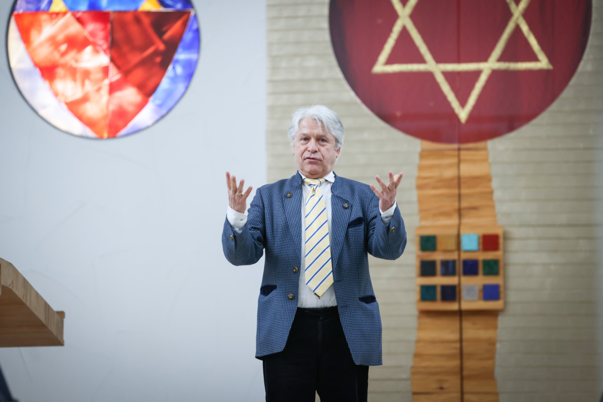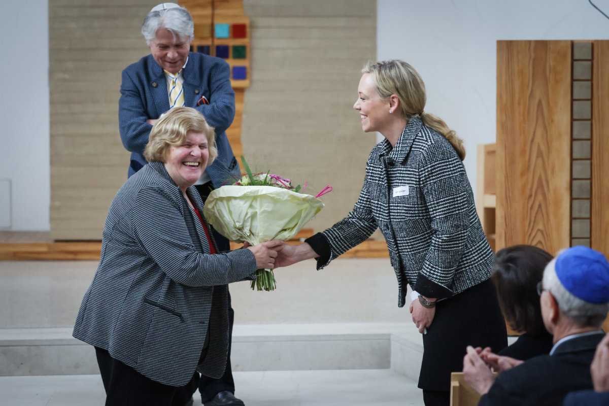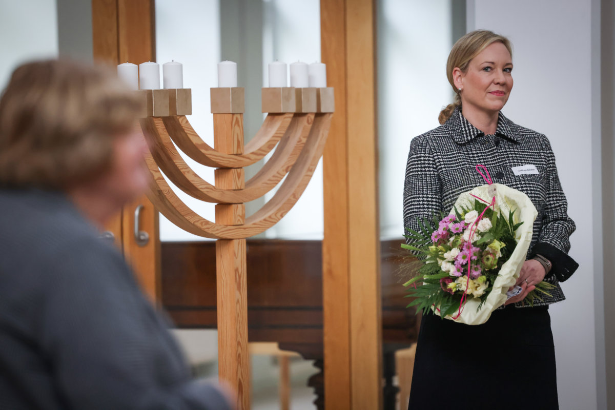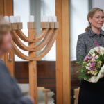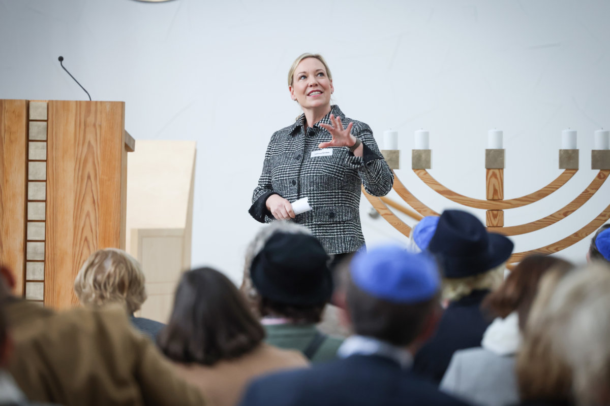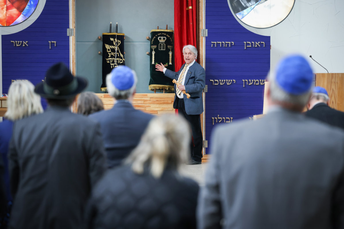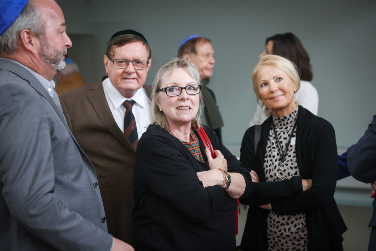 Vor dem abschließenden informellen Austausch bei koscherem Wein stellte Kantor Paul Yuval Adam die baulichen Veränderungen an der ehemaligen evangelischen Paul-Gerhardt-Kirche vor. Sie wurde 2008 zur Synagoge umgebaut. „Wir fühlen uns in der Nachbarschaft und Stadtgesellschaft gut aufgehoben“, erklärte Irith Michelsohn abschließend. Dennoch stehe die Synagoge zum Schutz vor antisemitischer Gewalt ständig unter Polizeischutz. Ein Besuch für Nicht-Gemeindemitglieder ist nur nach Anmeldung und Taschenkontrolle möglich. „Mein Wunsch für die Zukunft wäre mehr Normalität“, so die Gemeindevorsitzende. „Ich möchte gern einmal zu spät zum Gottesdienst kommen können, ohne vorher an der Tür klingeln zu müssen“.