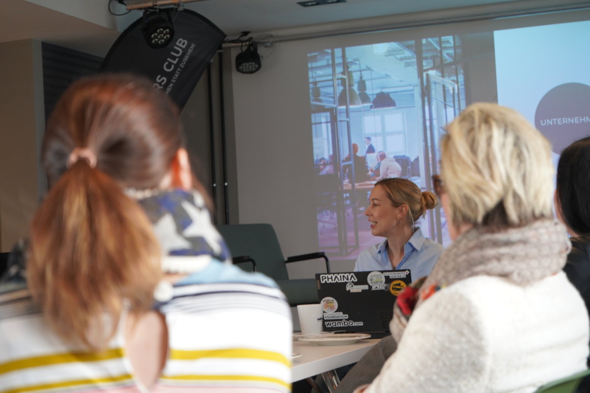 Anschließend berichteten zwei Gründerinnen den weiblichen IHC-Mitgliedern von ihren Erfahrungen und stellten ihre Firmen vor: „no planet b“ heißt das Start-up, das Jessica Wölke gründete. Sie entwickelte gemeinsam mit ihrem Mann Sebastian ein Upcycling-Beauty-Label. Für die Kosmetikprodukte wie Shampoo, Conditioner oder Seife werden vorhandene Ressourcen, die zum Beispiel bei der Lebensmittelproduktion entstehen, genutzt. Durch diese Art der Wiederverwertung kann auf neu produzierte Rohmaterialien verzichtet werden. Im Falle von „no planet b“ wird Übriggebliebenes aus der Fruchtsaftproduktion, Lebensmittelindustrie, Ernte und Ölherstellung upgecycelt. Statt zu Müll werden so zum Beispiel Mandelkerne aus der Mandeelölherstellung, Blaubeersamenöl aus der Lebensmittelproduktion und Apfelfruchtwasser aus der Saftproduktion zu einem Duschgel. Mit ihrer Idee überzeugten die Gründer die Drogeriemarktkette DM, welche die Produkte mittlerweile als exklusive Kooperationsmarke im Sortiment führt.