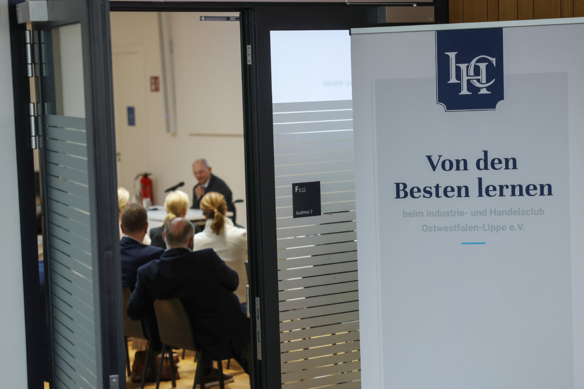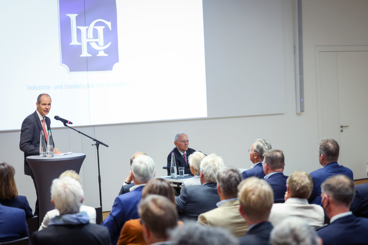 Nach einigen Terminverschiebungen hatte es nun endlich geklappt: Wolfgang Schäuble, CDU-Bundestagsabgeordneter, ehemaliger Innen- und Finanzminister, CDU-Präsidiumsmitglied und bis 2021 Präsident des Deutschen Bundetags, war der Einladung des Industrie- und Handelsclubs OWL gefolgt und sprach vor 150 Gästen im Goldbeck-Audimax. Weitere zahlreiche Mitglieder waren online der Veranstaltung zugeschaltet.